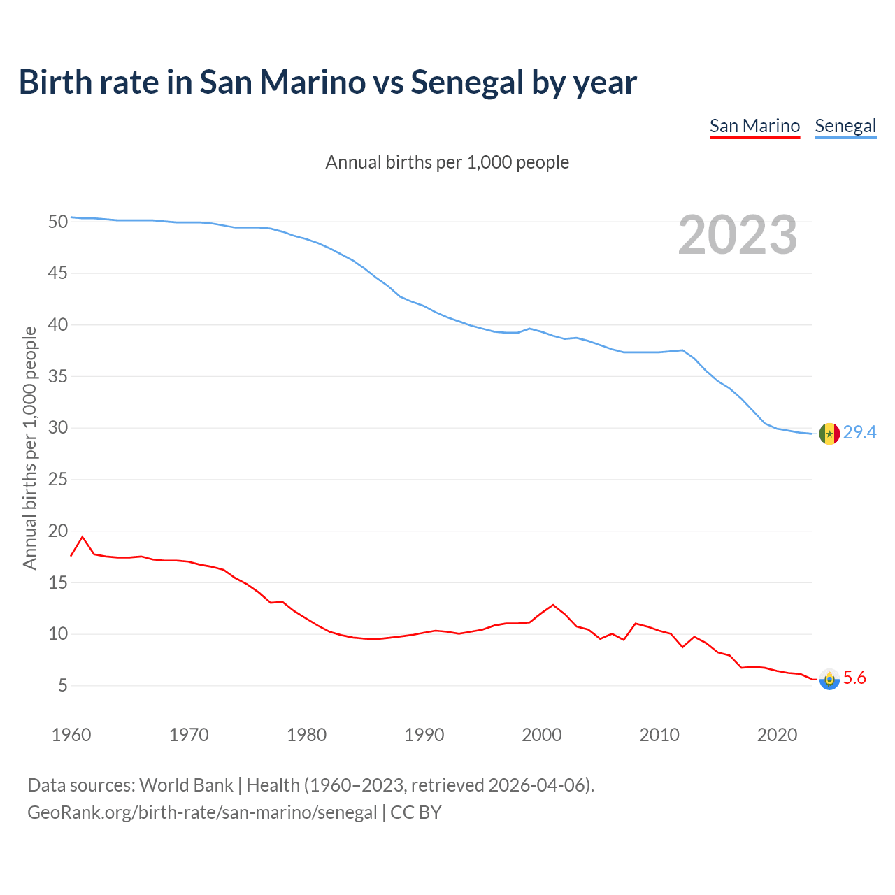 San Marino has an annual birth rate of 5.6 births per 1,000 people, compared to 29.4 for Senegal. The average number of children a woman is expected to have during her lifetime — the fertility rate, is 1.15 in San Marino and 3.82 in Senegal — 232.3% difference.