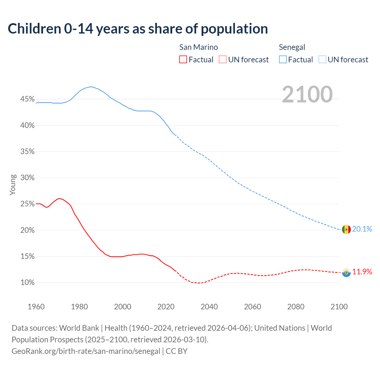 According to the latest available data on birth rates, the fertility rate in San Marino was 1.15 children per woman in 2023, compared to 3.82 in Senegal in 2023. The replacement level is considered to be 2.1 children per woman.