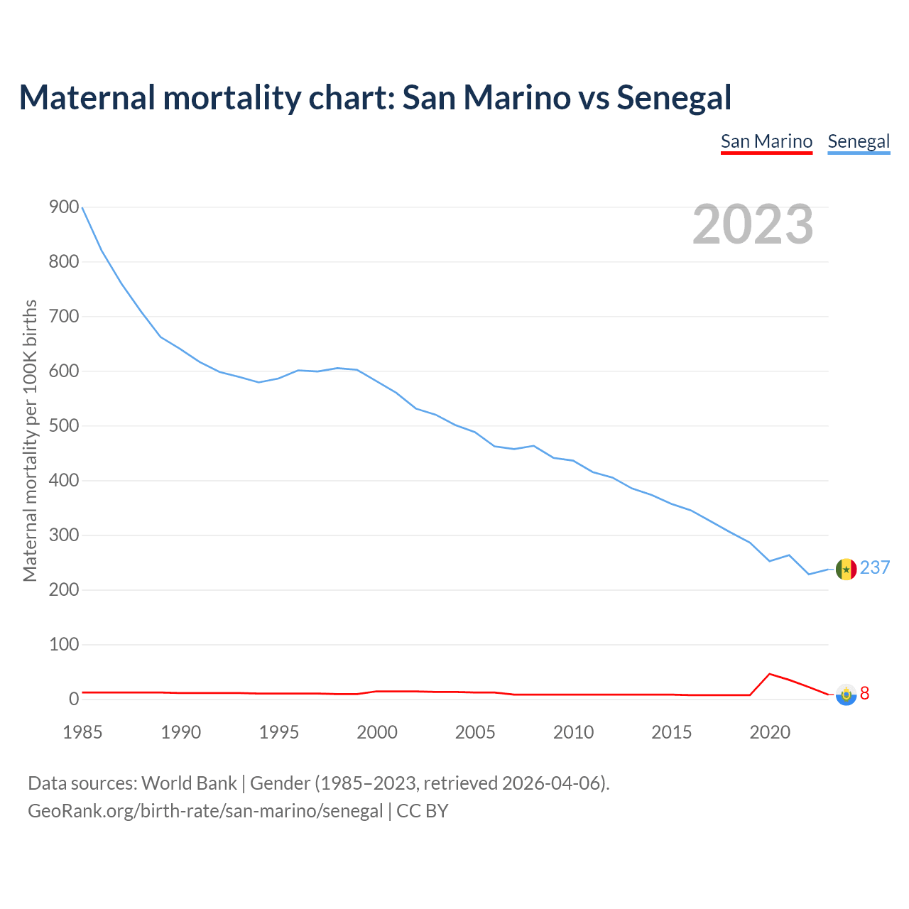 The maternal mortality rate, which is the probability of dying during childbirth or within 42 days of pregnancy termination, is 8 deaths per 100,000 live births in San Marino, compared to 237 deaths in Senegal.