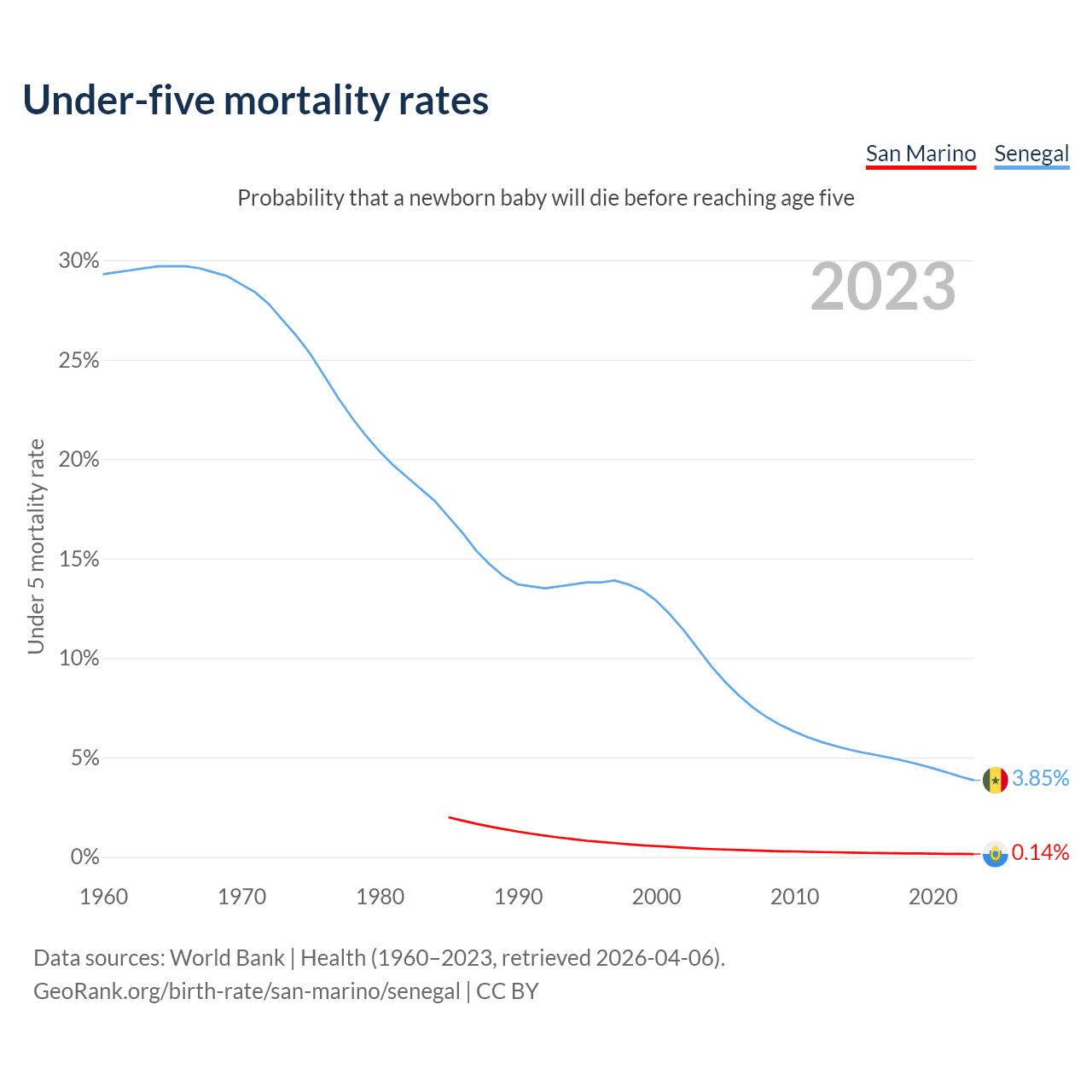 The chance that a newborn baby will die before reaching age five is 0.14% in San Marino and 3.85% in Senegal. Above is a chart with historical data on under-five mortality rates.