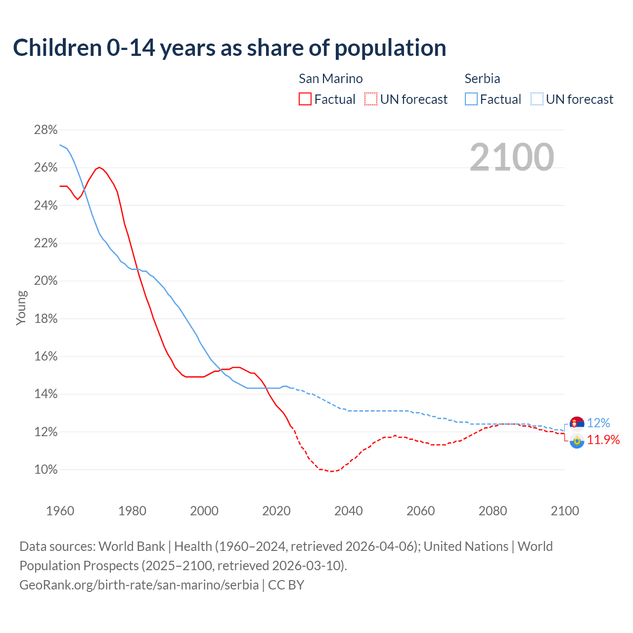 Children aged 0-14 make up 12.3% of the population in San Marino and 14.3% in Serbia in 2024, compared to 16.1% and 19.3% respectively in 1990.