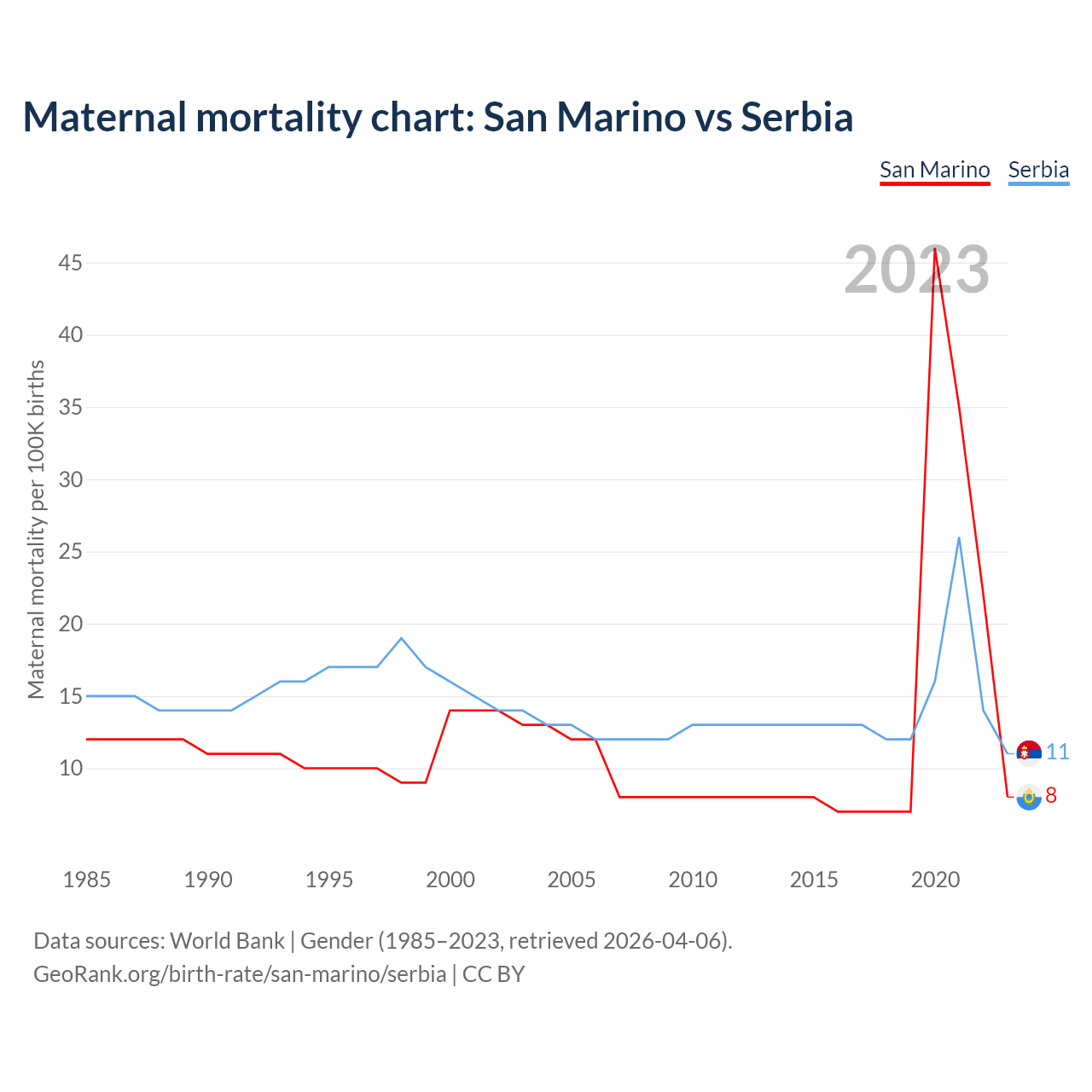 The maternal mortality rate, which is the probability of dying during childbirth or within 42 days of pregnancy termination, is 8 deaths per 100,000 live births in San Marino, compared to 11 deaths in Serbia.