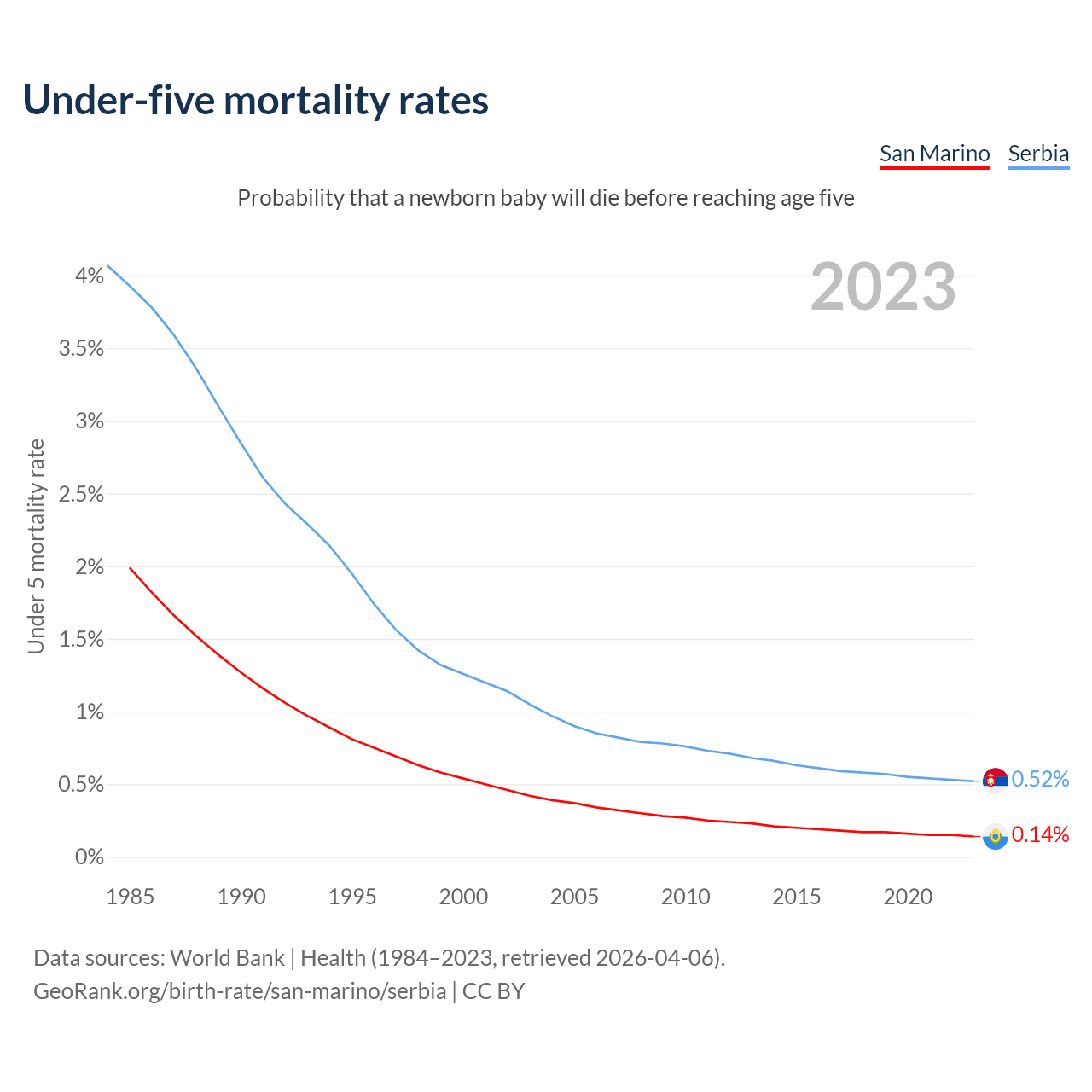 The chance that a newborn baby will die before reaching age five is 0.14% in San Marino and 0.52% in Serbia. Above is a chart with historical data on under-five mortality rates.