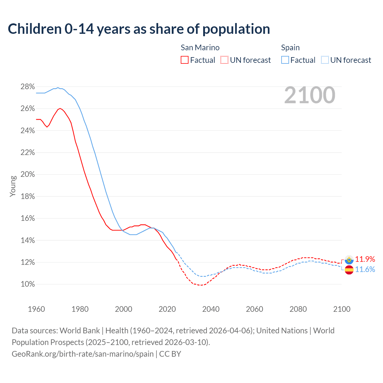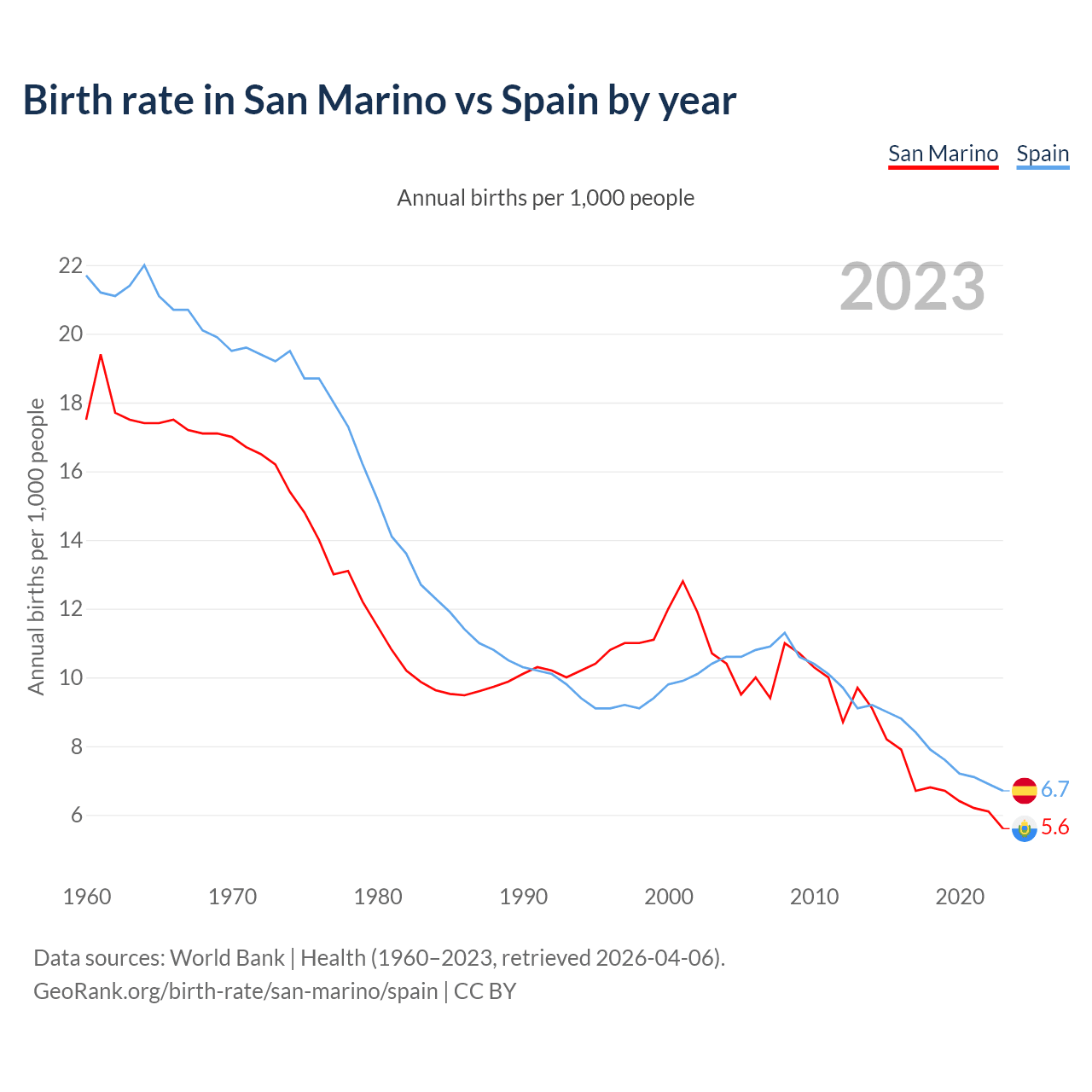 According to the latest available data on birth rates, the fertility rate in San Marino was 1.15 children per woman in 2023, compared to 1.12 in Spain in 2023. The replacement level is considered to be 2.1 children per woman.