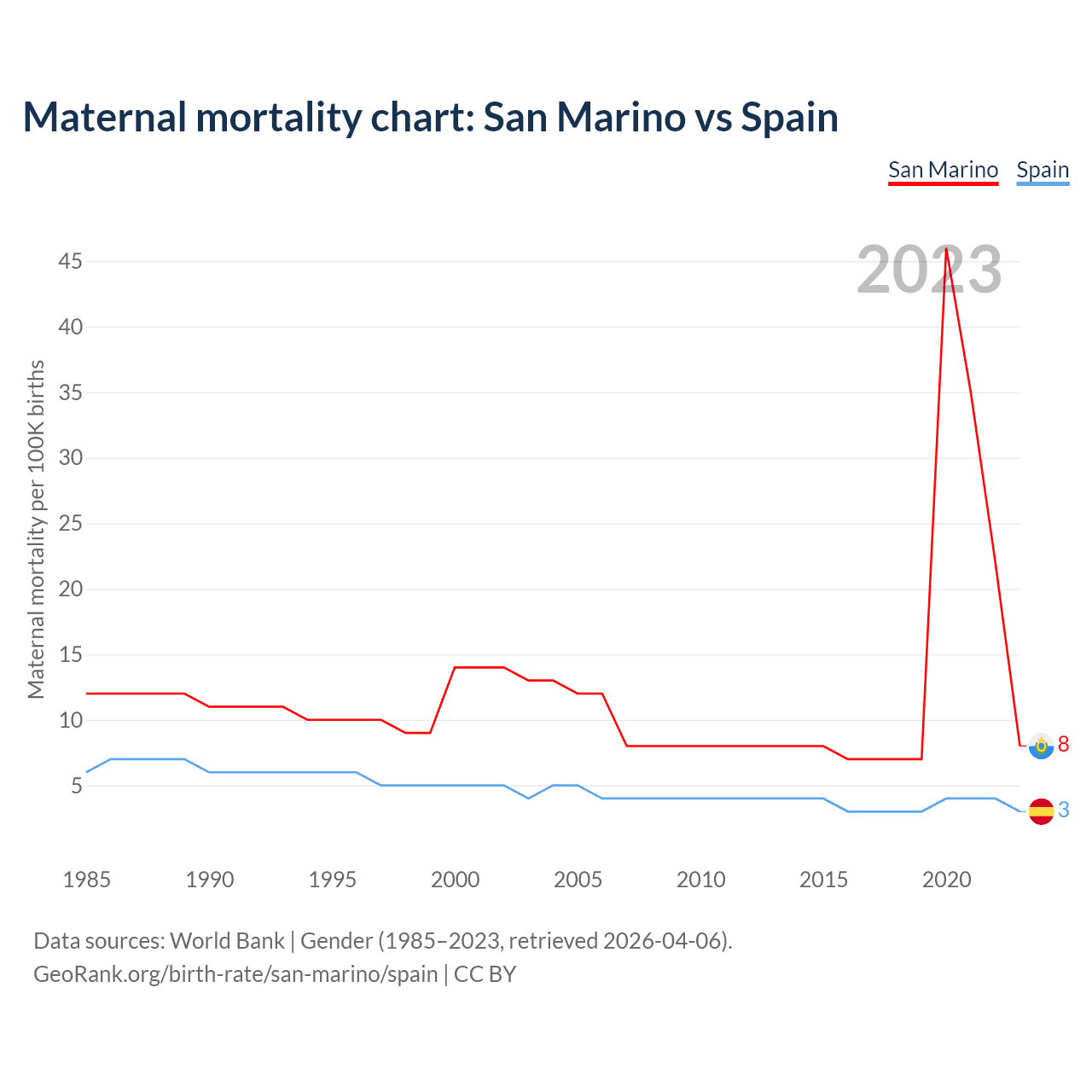 The maternal mortality rate, which is the probability of dying during childbirth or within 42 days of pregnancy termination, is 8 deaths per 100,000 live births in San Marino, compared to 3 deaths in Spain.