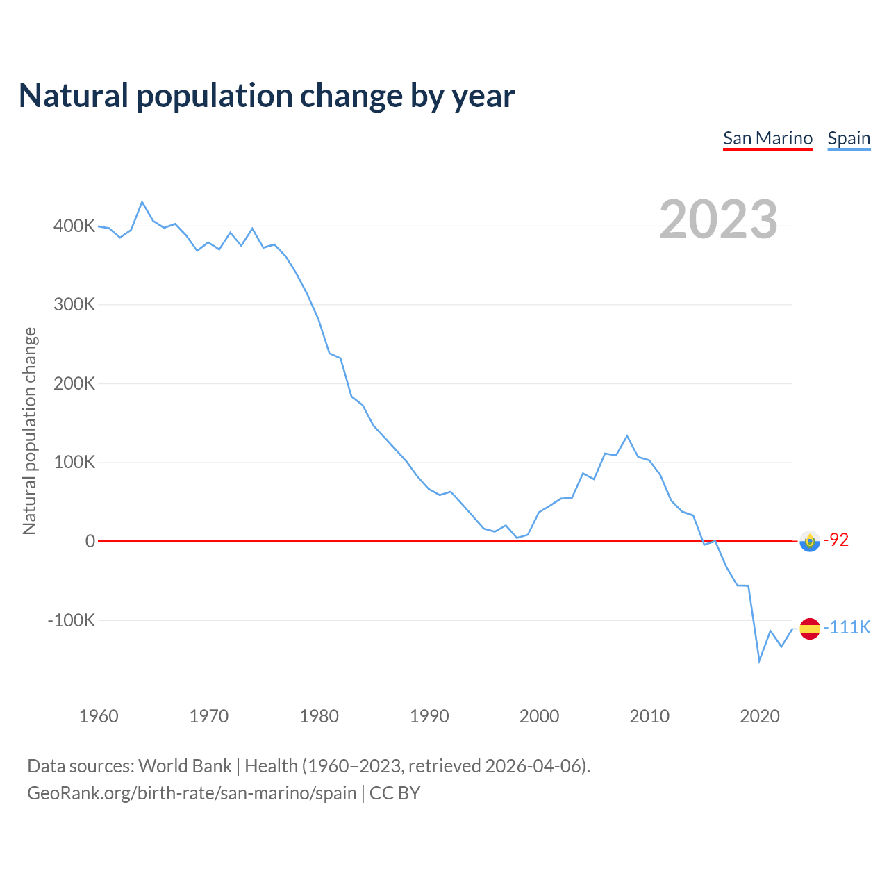 - San Marino is ranked 195/196 by birth rate compared to 189/196 for Spain.
