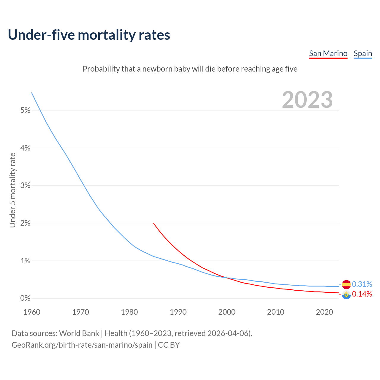 The chance that a newborn baby will die before reaching age five is 0.14% in San Marino and 0.31% in Spain. Above is a chart with historical data on under-five mortality rates.