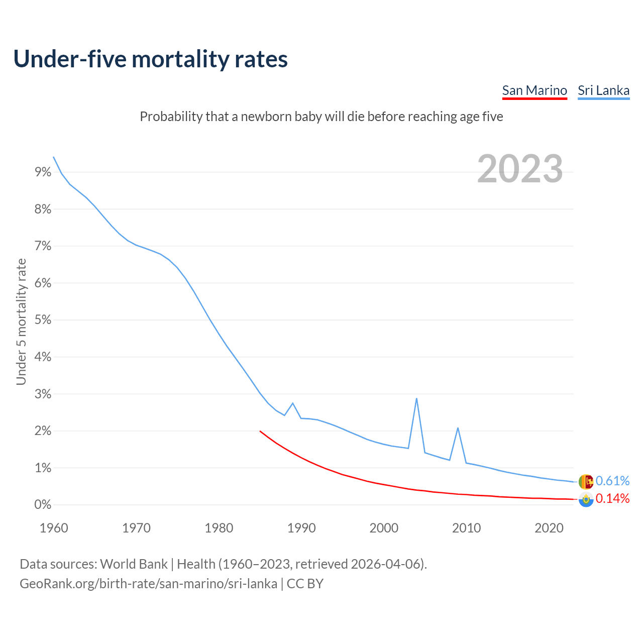 The chance that a newborn baby will die before reaching age five is 0.14% in San Marino and 0.61% in Sri Lanka. Above is a chart with historical data on under-five mortality rates.