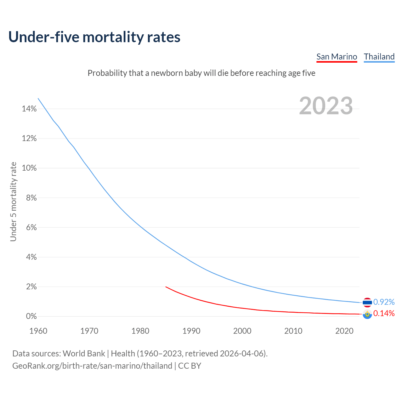 The chance that a newborn baby will die before reaching age five is 0.14% in San Marino and 0.92% in Thailand. Above is a chart with historical data on under-five mortality rates.
