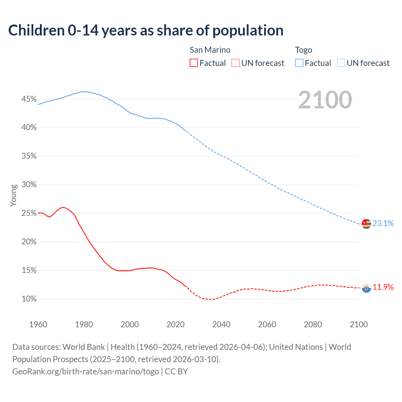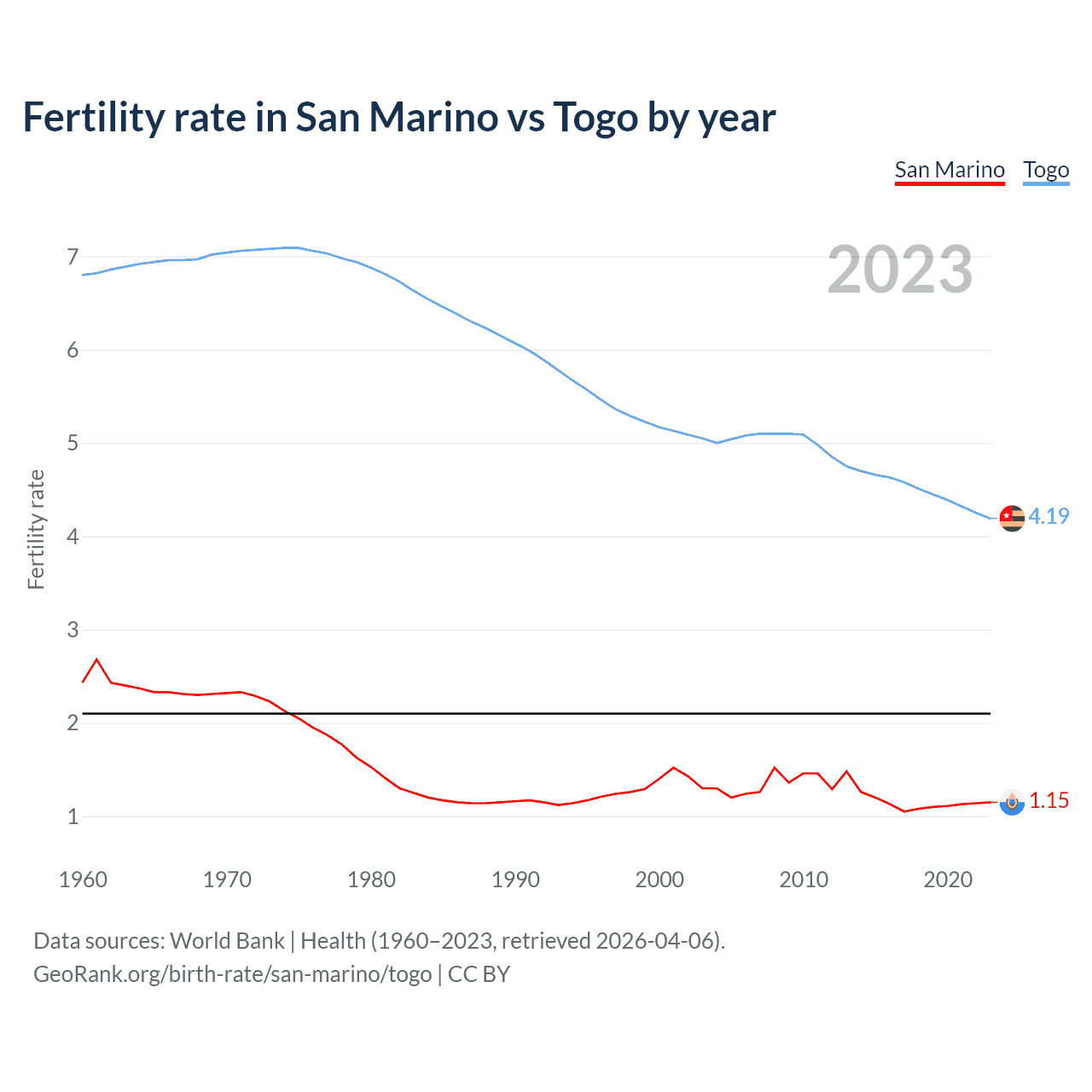 San Marino has an annual birth rate of 5.6 births per 1,000 people, compared to 31.1 for Togo. The average number of children a woman is expected to have during her lifetime — the fertility rate, is 1.15 in San Marino and 4.19 in Togo — 264.8% difference.