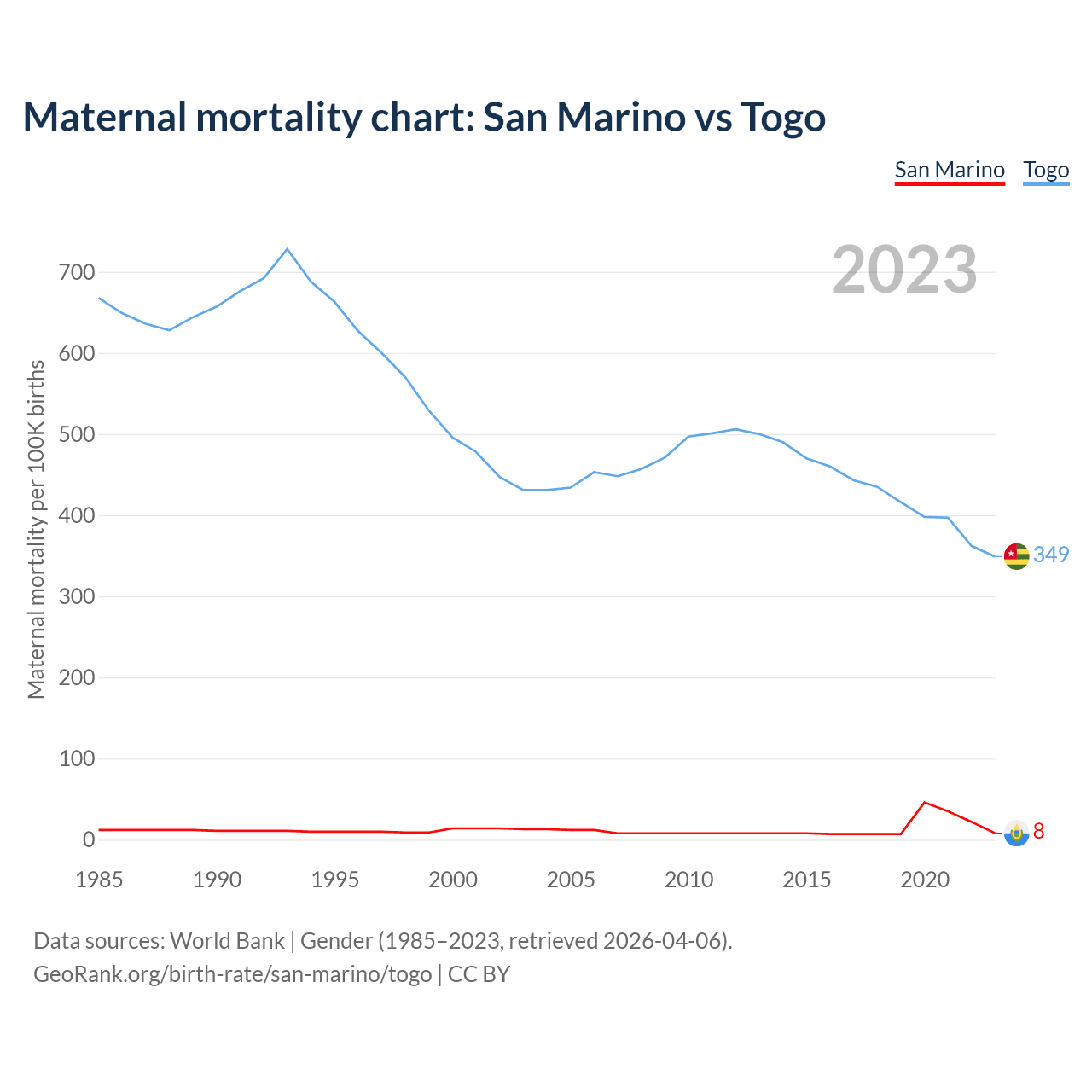 The maternal mortality rate, which is the probability of dying during childbirth or within 42 days of pregnancy termination, is 8 deaths per 100,000 live births in San Marino, compared to 349 deaths in Togo.