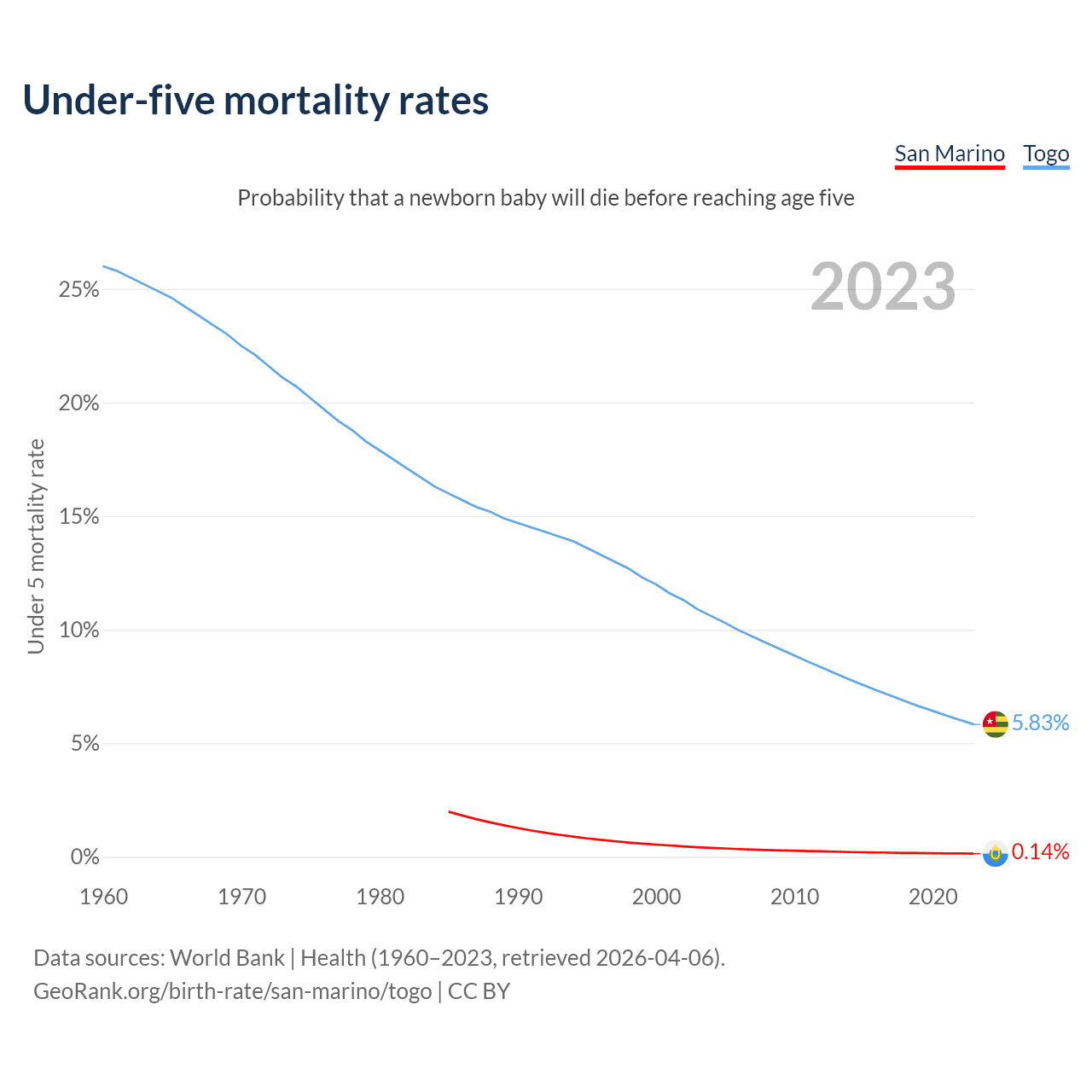 The chance that a newborn baby will die before reaching age five is 0.14% in San Marino and 5.83% in Togo. Above is a chart with historical data on under-five mortality rates.
