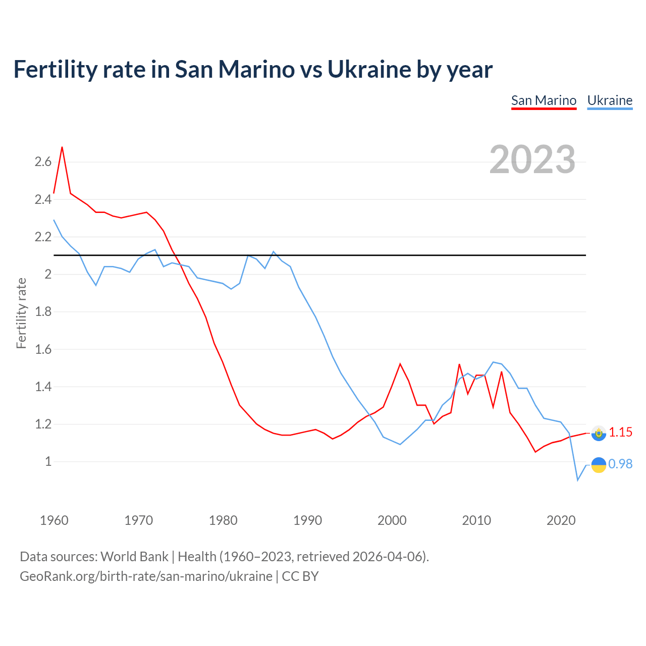 According to the latest available data on birth rates, the fertility rate in San Marino was 1.15 children per woman in 2023, compared to 0.98 in Ukraine in 2023. The replacement level is considered to be 2.1 children per woman.