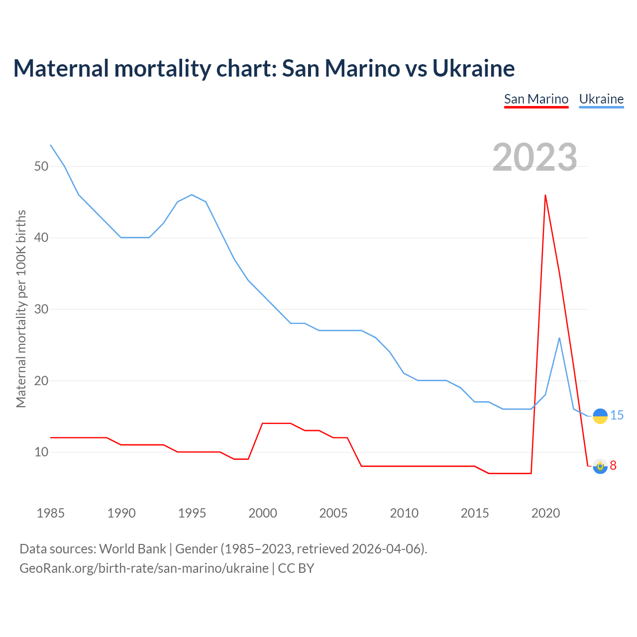 The maternal mortality rate, which is the probability of dying during childbirth or within 42 days of pregnancy termination, is 8 deaths per 100,000 live births in San Marino, compared to 15 deaths in Ukraine.