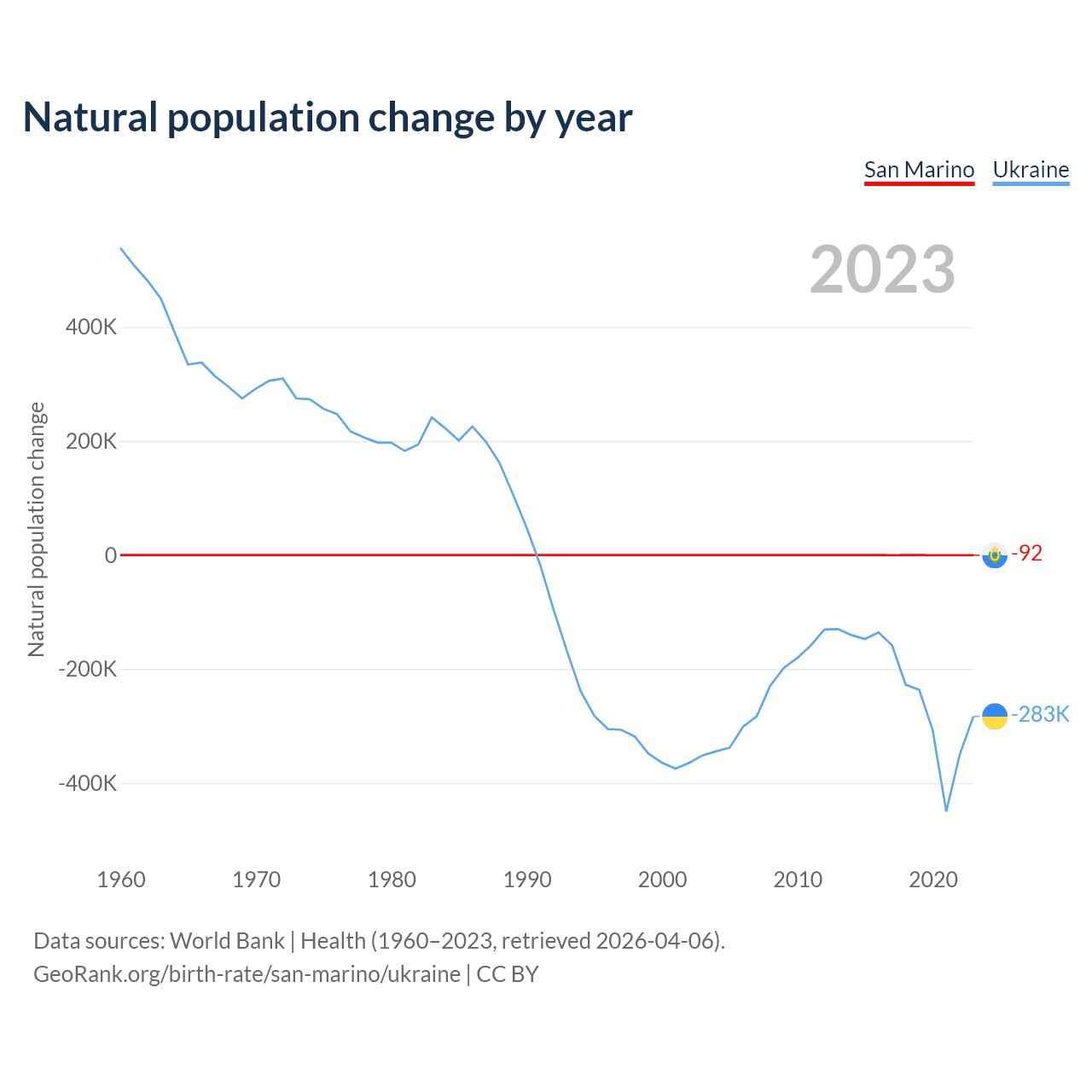 San Marino has an annual birth rate of 5.6 births per 1,000 people, compared to 5.63 for Ukraine. The average number of children a woman is expected to have during her lifetime — the fertility rate, is 1.15 in San Marino and 0.98 in Ukraine — 15% difference.