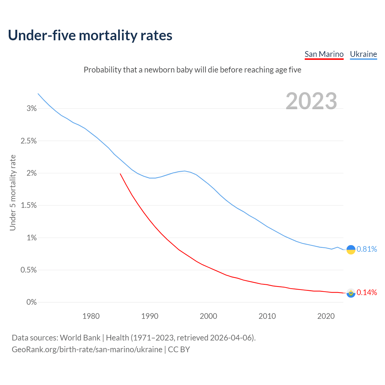 The chance that a newborn baby will die before reaching age five is 0.14% in San Marino and 0.81% in Ukraine. Above is a chart with historical data on under-five mortality rates.
