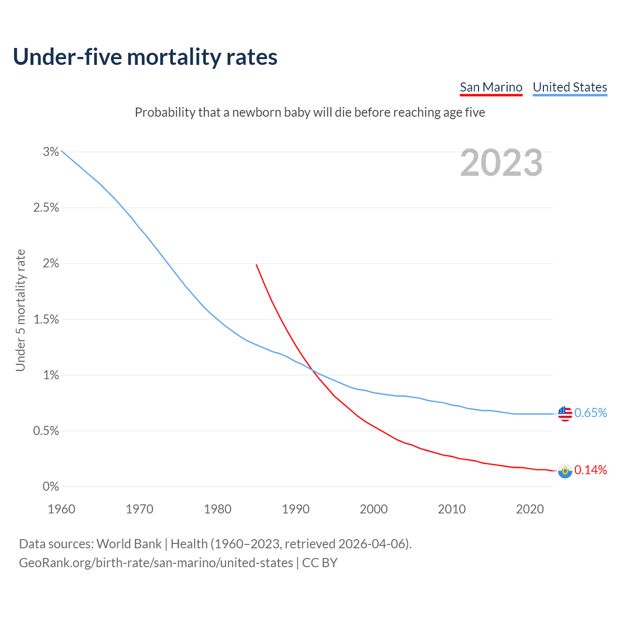 The chance that a newborn baby will die before reaching age five is 0.14% in San Marino and 0.65% in the United States. Above is a chart with historical data on under-five mortality rates.