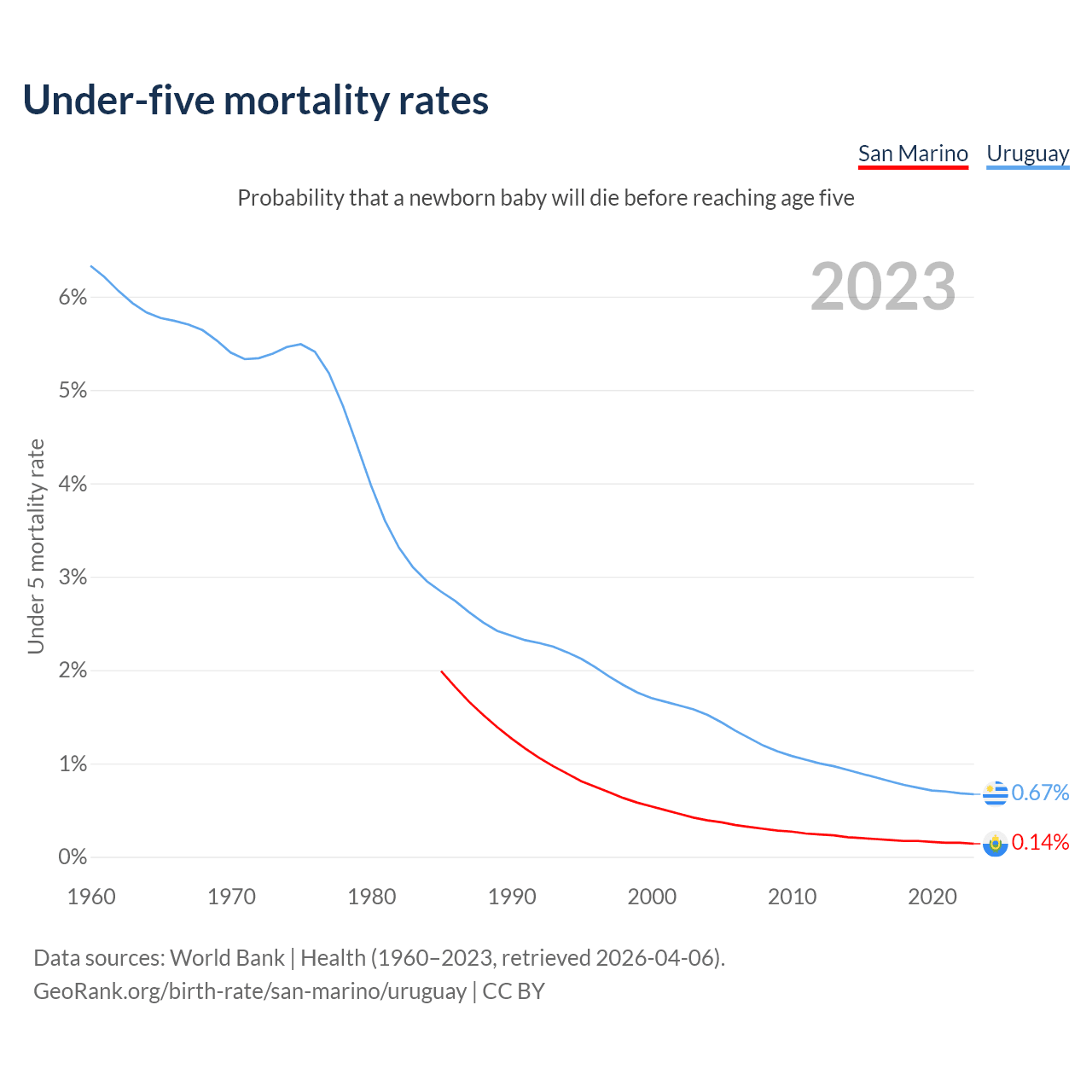 The chance that a newborn baby will die before reaching age five is 0.14% in San Marino and 0.67% in Uruguay. Above is a chart with historical data on under-five mortality rates.