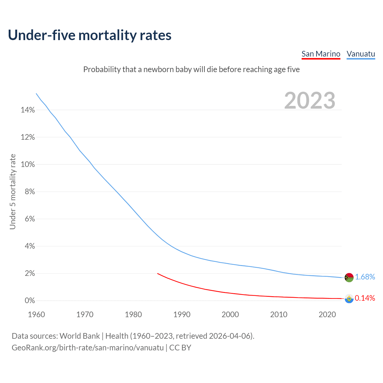 The chance that a newborn baby will die before reaching age five is 0.14% in San Marino and 1.68% in Vanuatu. Above is a chart with historical data on under-five mortality rates.