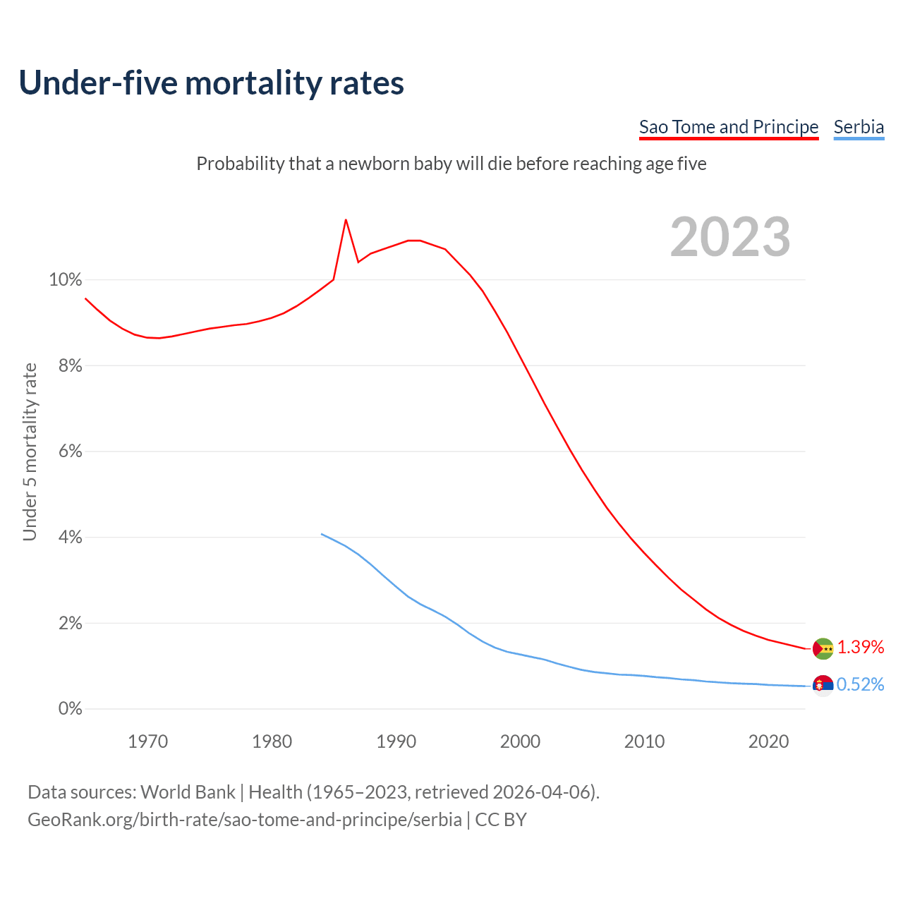 The chance that a newborn baby will die before reaching age five is 1.39% in Sao Tome and Principe and 0.52% in Serbia. Above is a chart with historical data on under-five mortality rates.
