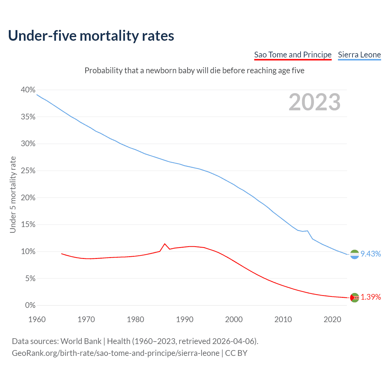The chance that a newborn baby will die before reaching age five is 1.39% in Sao Tome and Principe and 9.43% in Sierra Leone. Above is a chart with historical data on under-five mortality rates.
