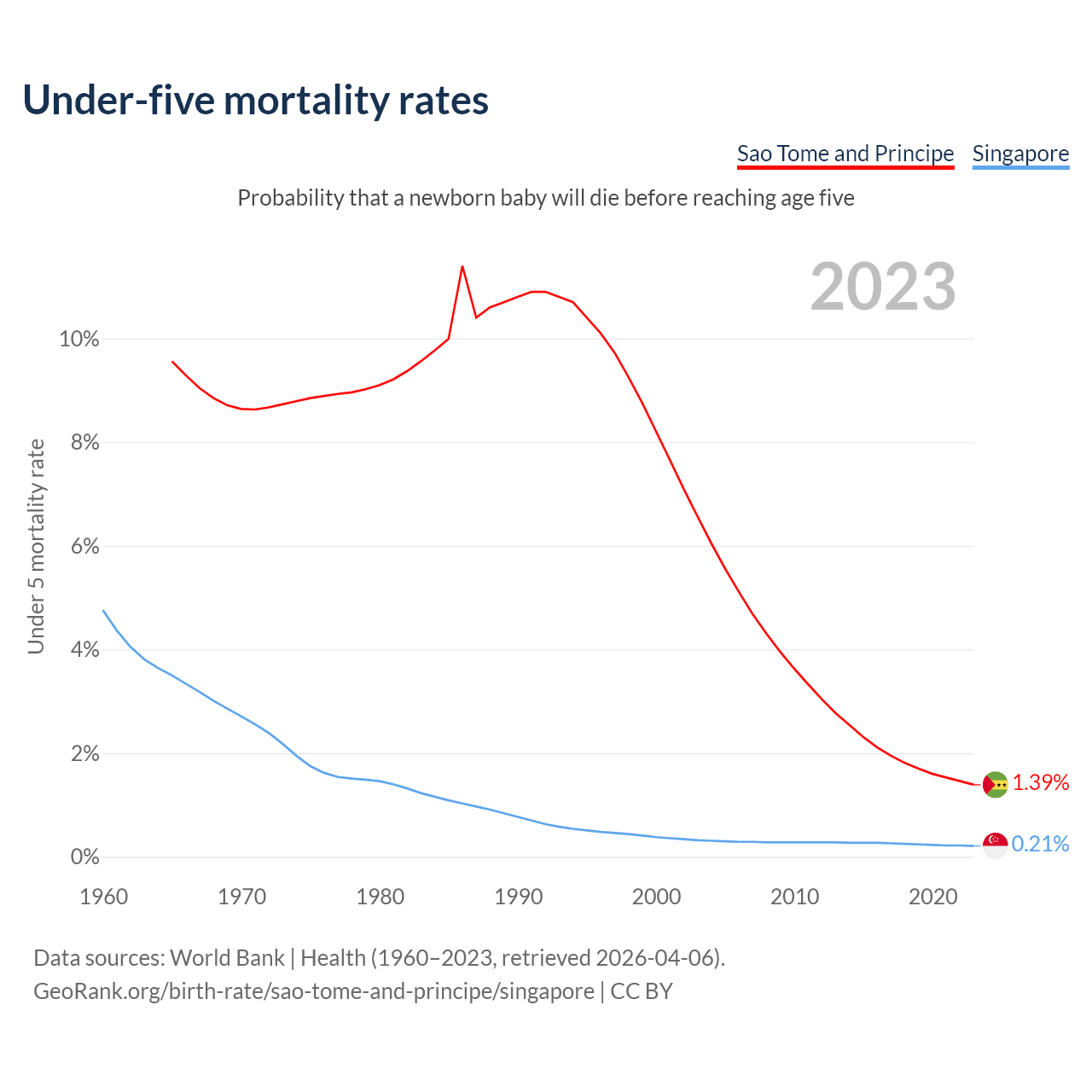 The chance that a newborn baby will die before reaching age five is 1.39% in Sao Tome and Principe and 0.21% in Singapore. Above is a chart with historical data on under-five mortality rates.