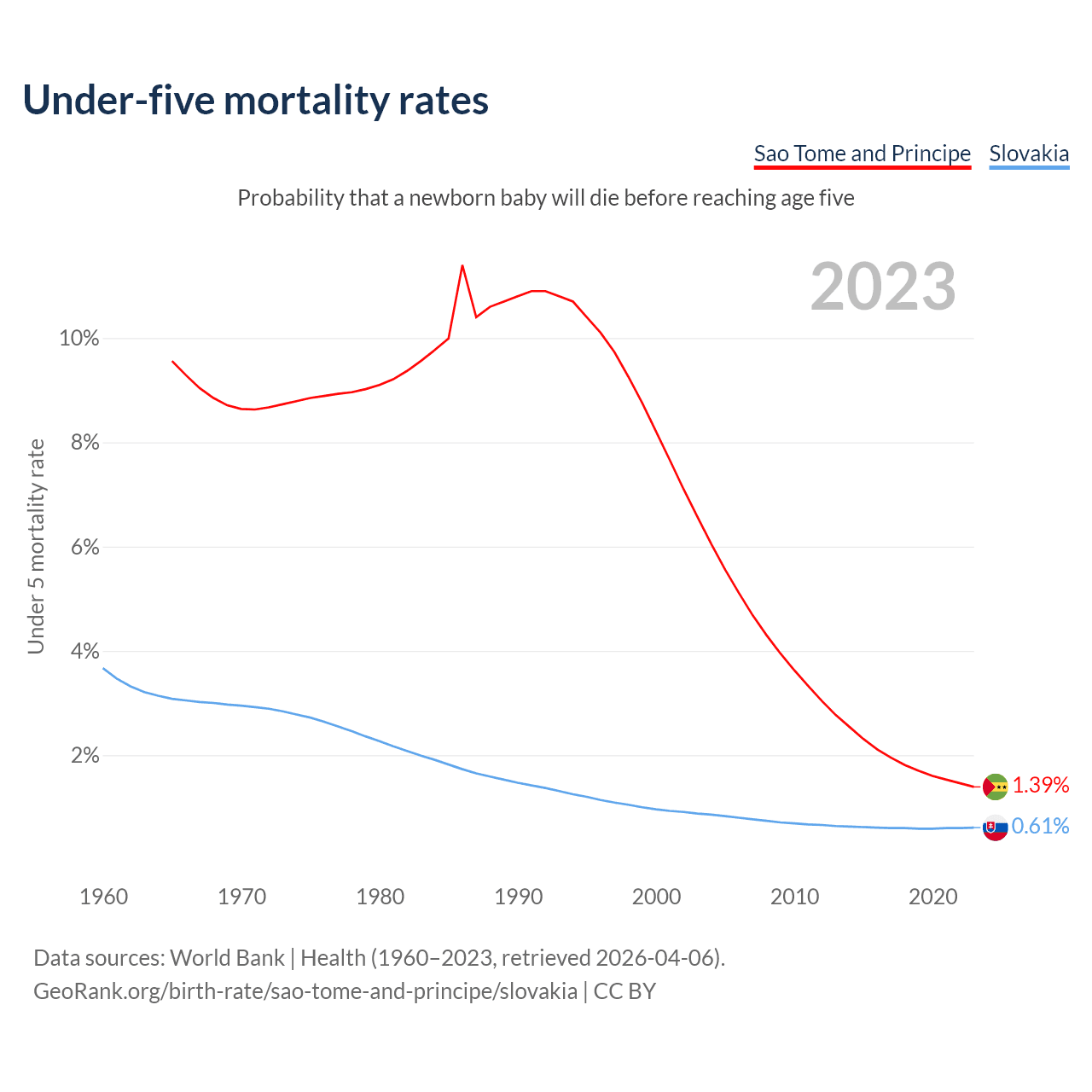 The chance that a newborn baby will die before reaching age five is 1.39% in Sao Tome and Principe and 0.61% in Slovakia. Above is a chart with historical data on under-five mortality rates.