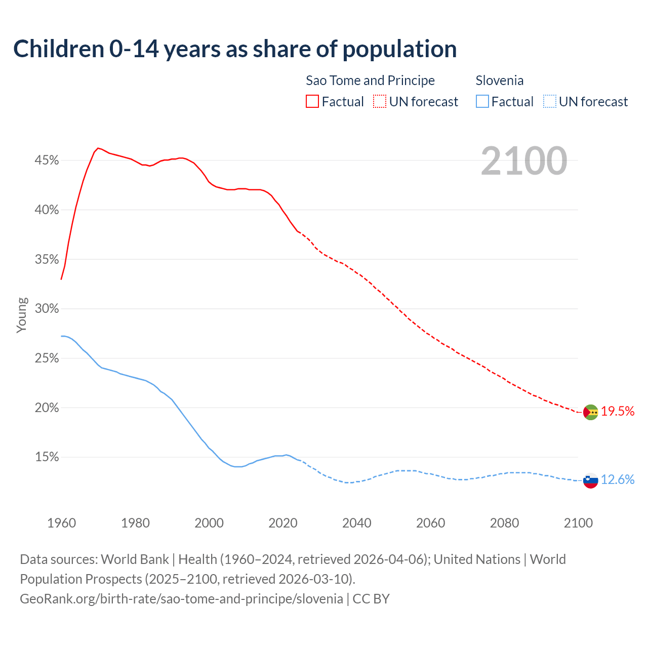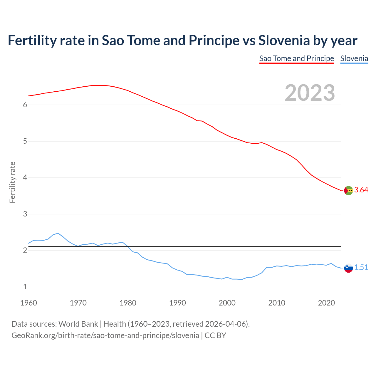 According to the latest available data on birth rates, the fertility rate in Sao Tome and Principe was 3.64 children per woman in 2023, compared to 1.51 in Slovenia in 2023. The replacement level is considered to be 2.1 children per woman.