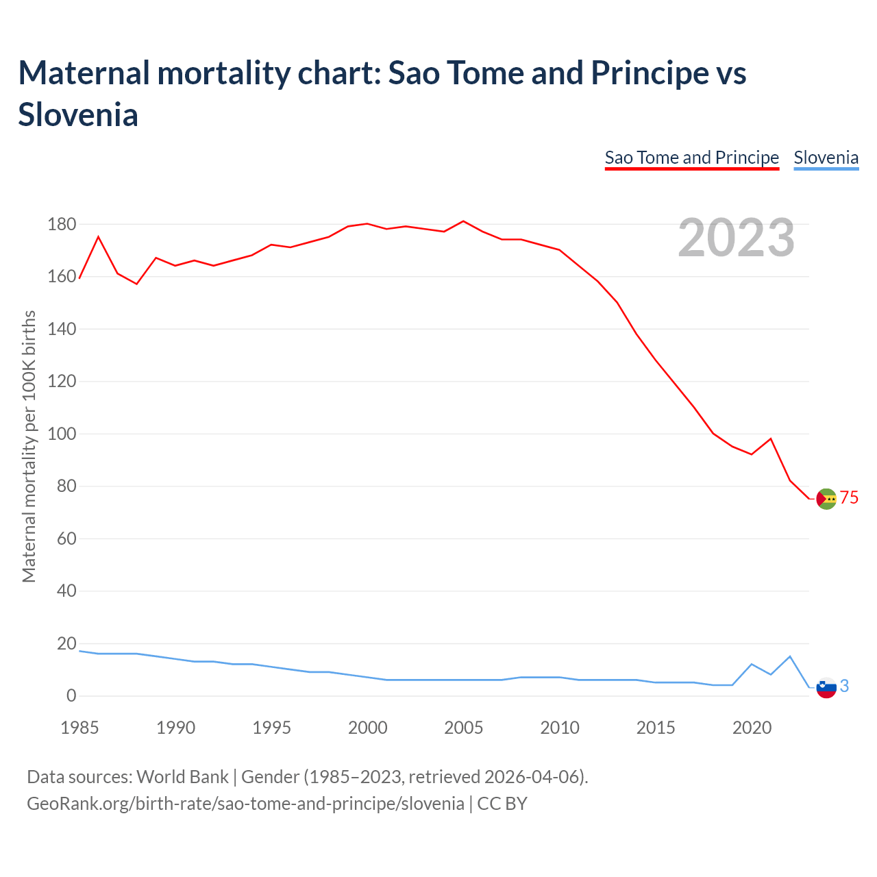 The maternal mortality rate, which is the probability of dying during childbirth or within 42 days of pregnancy termination, is 75 deaths per 100,000 live births in Sao Tome and Principe, compared to 3 deaths in Slovenia.