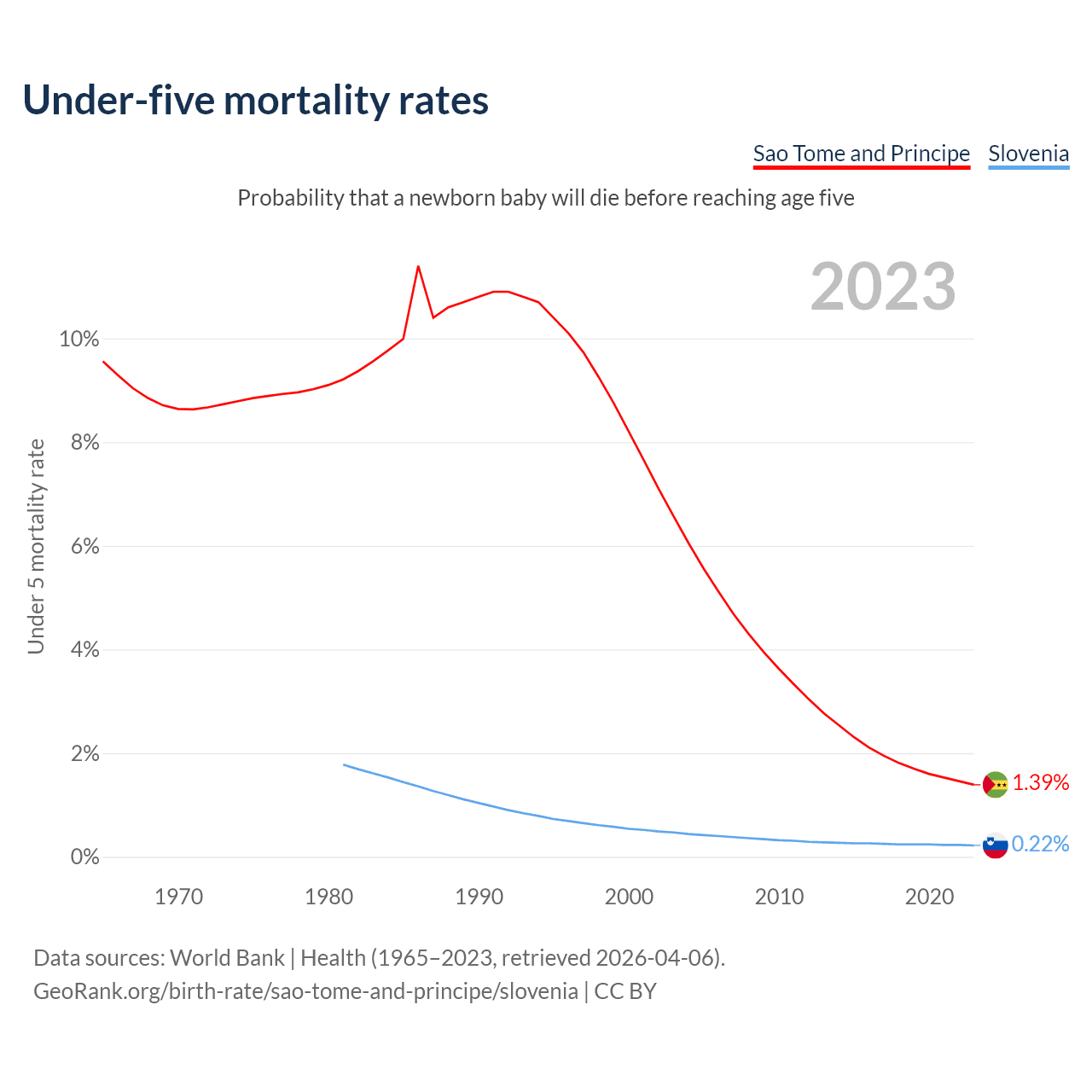 The chance that a newborn baby will die before reaching age five is 1.39% in Sao Tome and Principe and 0.22% in Slovenia. Above is a chart with historical data on under-five mortality rates.