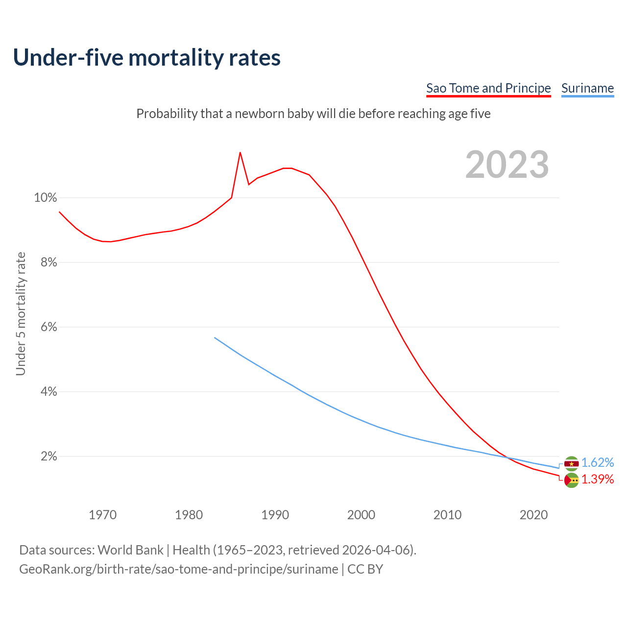 The chance that a newborn baby will die before reaching age five is 1.39% in Sao Tome and Principe and 1.62% in Suriname. Above is a chart with historical data on under-five mortality rates.