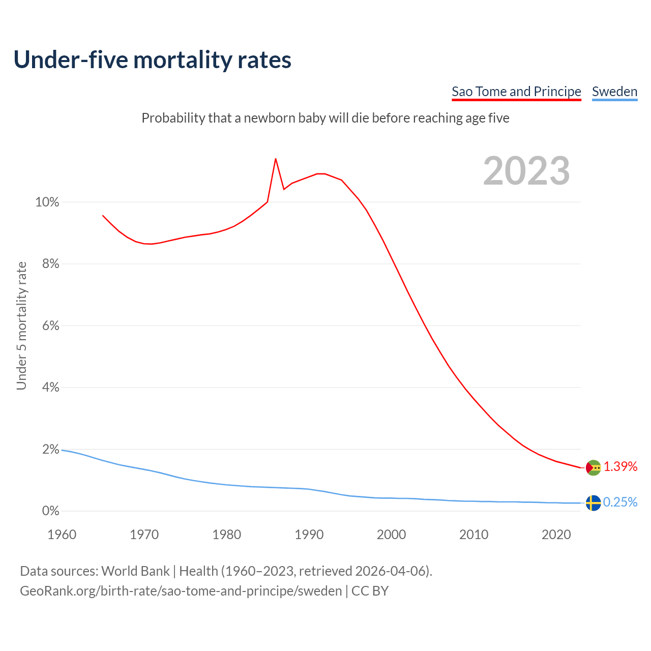 The chance that a newborn baby will die before reaching age five is 1.39% in Sao Tome and Principe and 0.25% in Sweden. Above is a chart with historical data on under-five mortality rates.