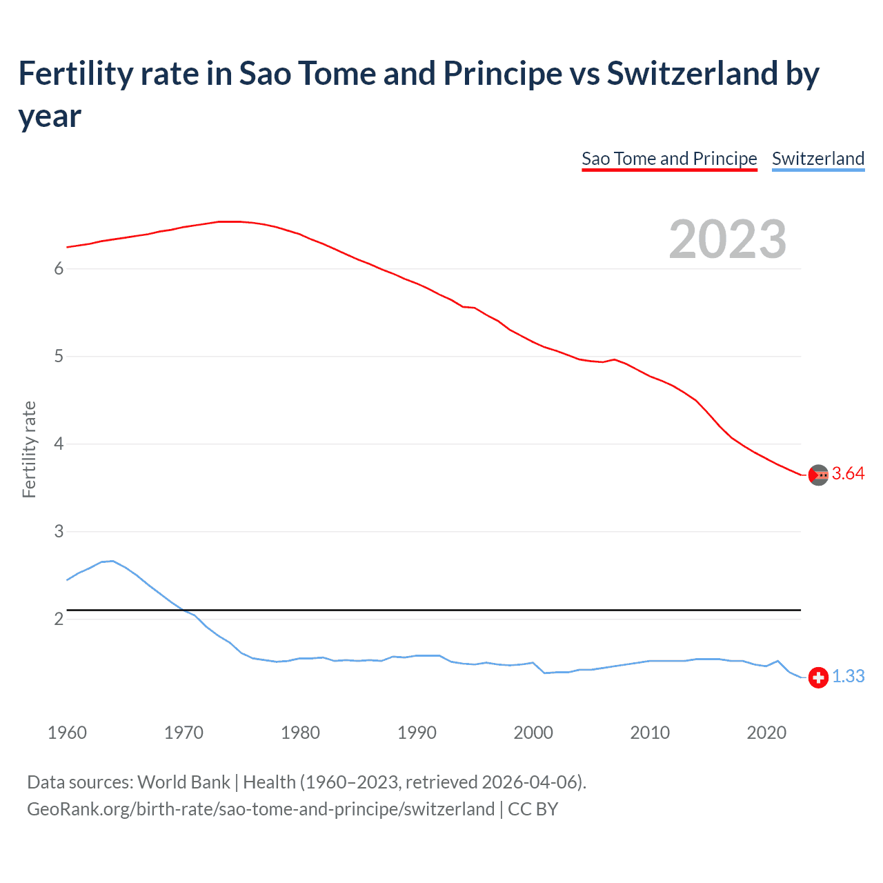 1960 vs 2023, the fertility rate has decreased by 41.6% in Sao Tome and Principe and by 45.5% in Switzerland — in 1960, it was 6.24 and 2.44, respectively.