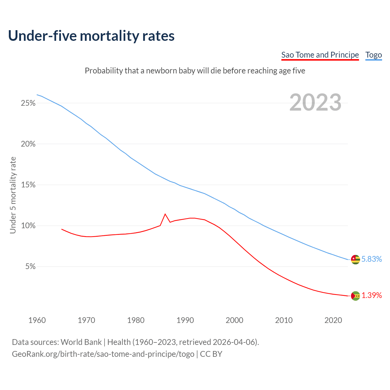 The chance that a newborn baby will die before reaching age five is 1.39% in Sao Tome and Principe and 5.83% in Togo. Above is a chart with historical data on under-five mortality rates.