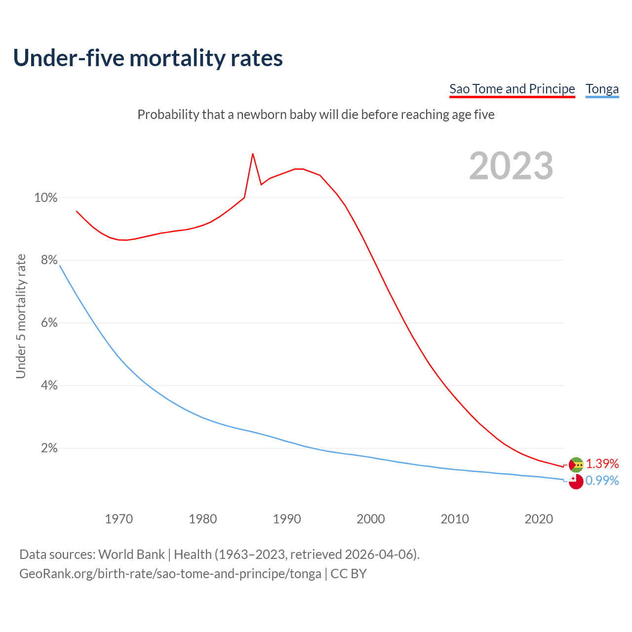The chance that a newborn baby will die before reaching age five is 1.39% in Sao Tome and Principe and 0.99% in Tonga. Above is a chart with historical data on under-five mortality rates.
