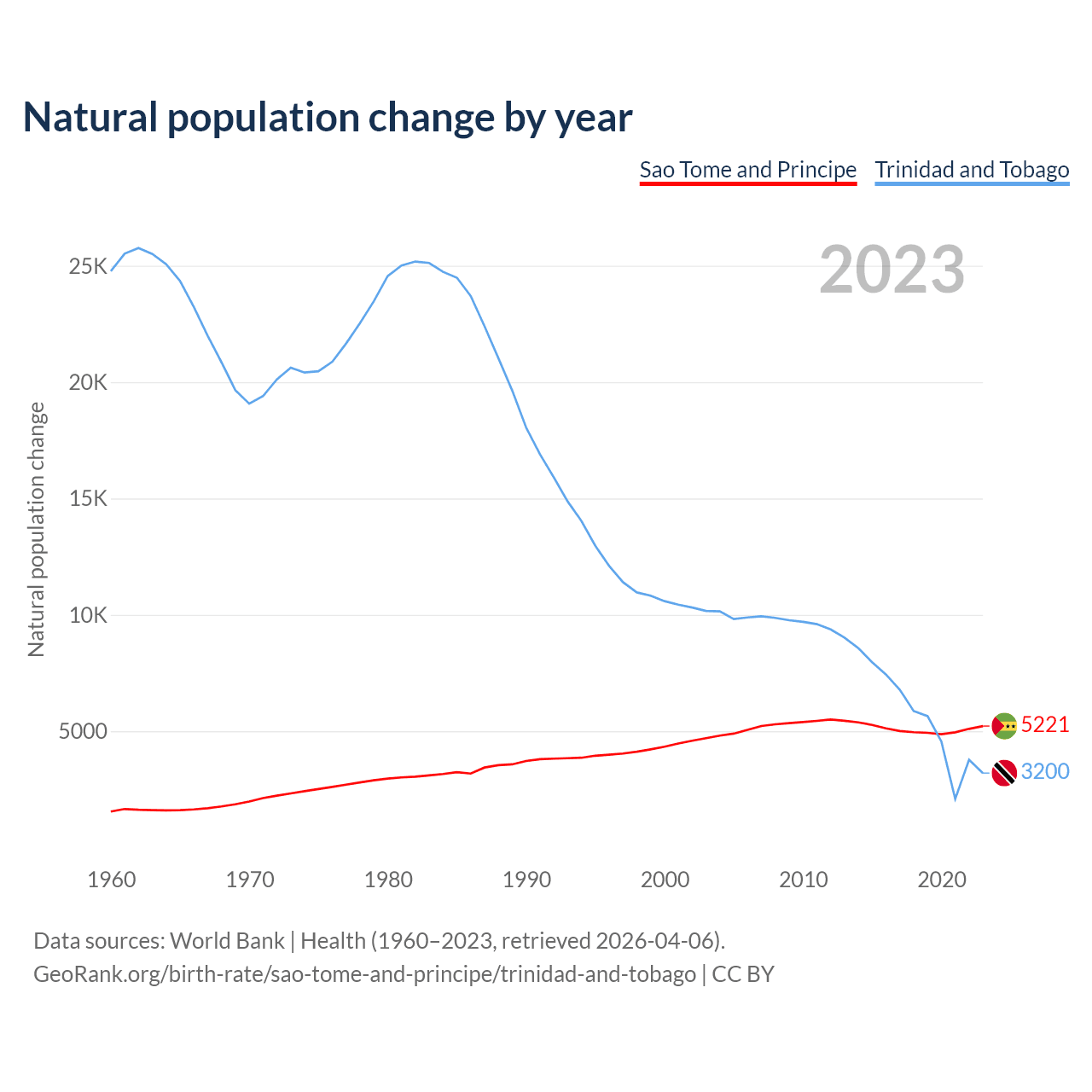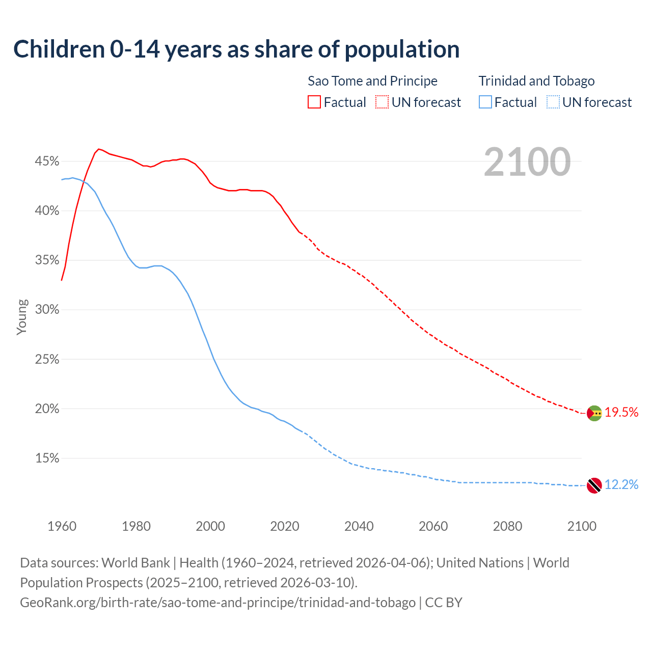 Sao Tome and Principe has an annual birth rate of 28.2 births per 1,000 people, compared to 10.7 for Trinidad and Tobago. The average number of children a woman is expected to have during her lifetime — the fertility rate, is 3.64 in Sao Tome and Principe and 1.53 in Trinidad and Tobago — 58% difference.