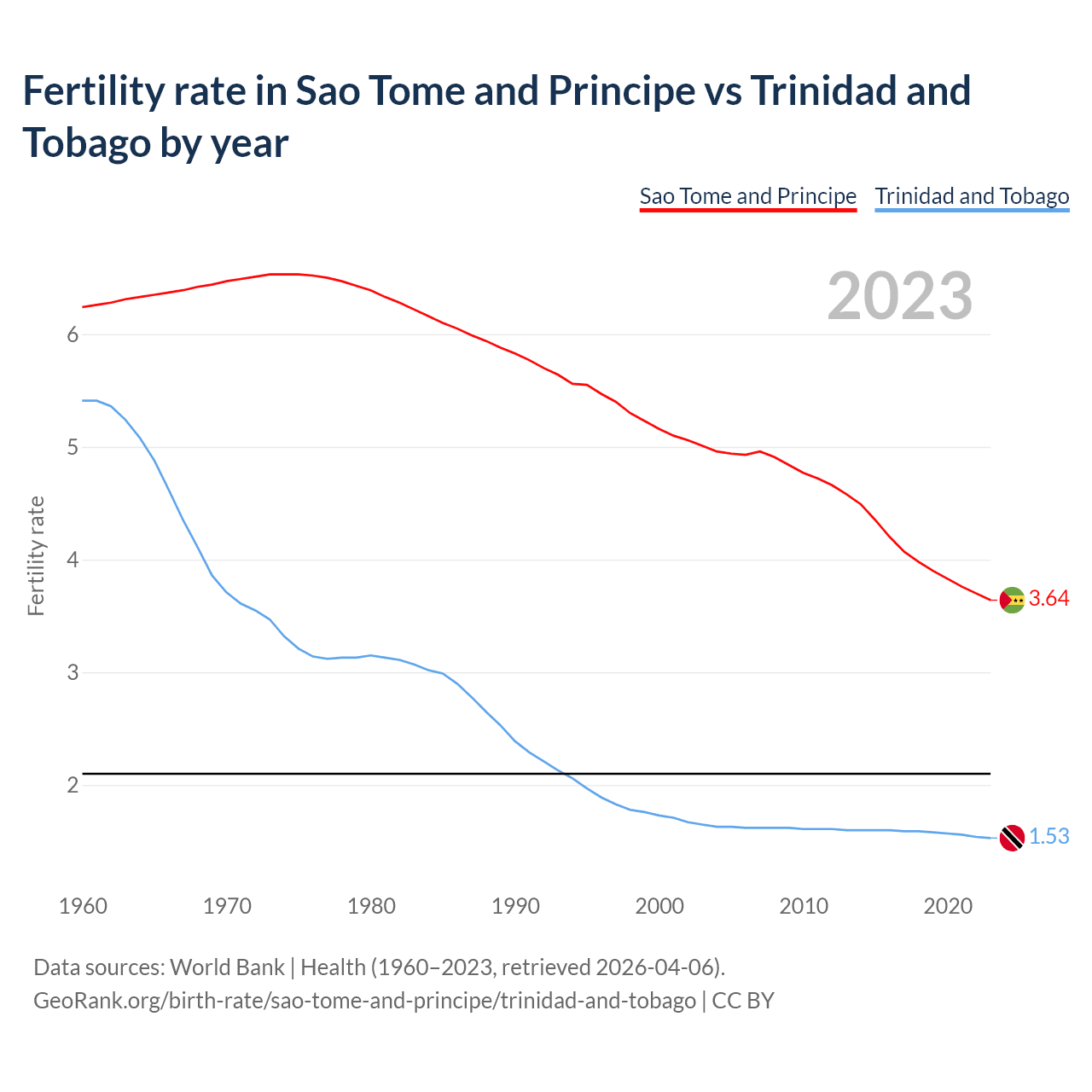 According to the latest available data on birth rates, the fertility rate in Sao Tome and Principe was 3.64 children per woman in 2023, compared to 1.53 in Trinidad and Tobago in 2023. The replacement level is considered to be 2.1 children per woman.