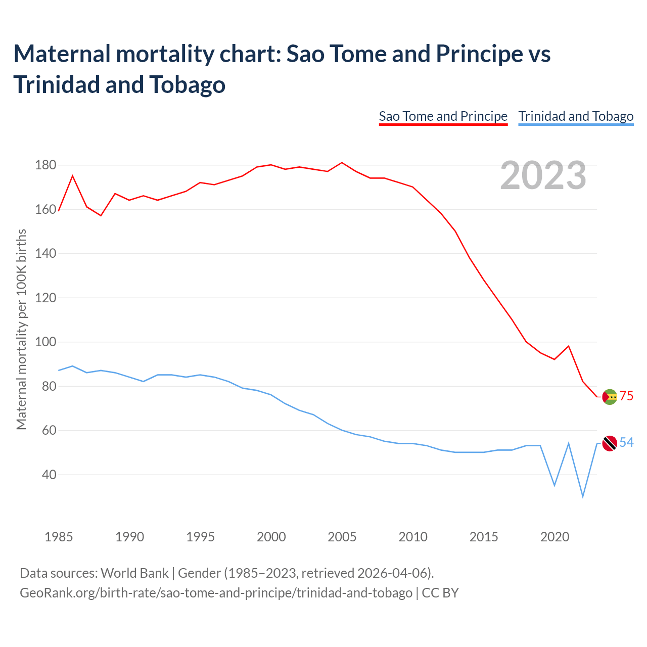The maternal mortality rate, which is the probability of dying during childbirth or within 42 days of pregnancy termination, is 75 deaths per 100,000 live births in Sao Tome and Principe, compared to 54 deaths in Trinidad and Tobago.