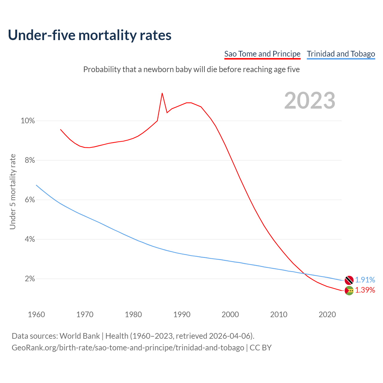 The chance that a newborn baby will die before reaching age five is 1.39% in Sao Tome and Principe and 1.91% in Trinidad and Tobago. Above is a chart with historical data on under-five mortality rates.