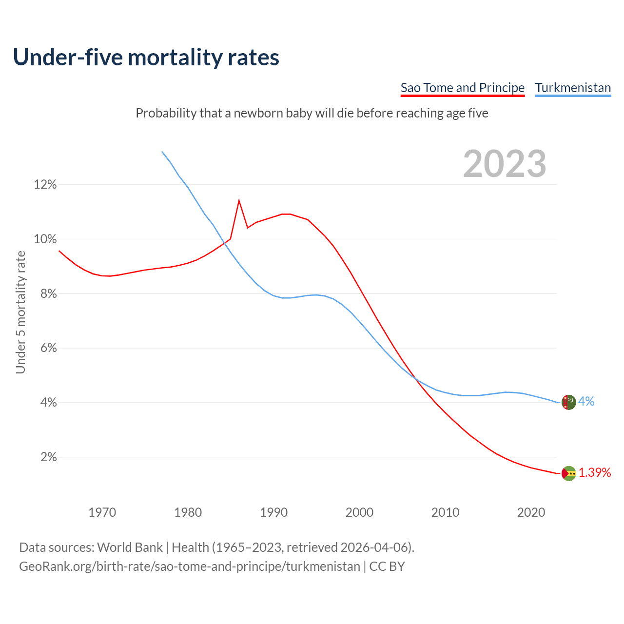 The chance that a newborn baby will die before reaching age five is 1.39% in Sao Tome and Principe and 4% in Turkmenistan. Above is a chart with historical data on under-five mortality rates.