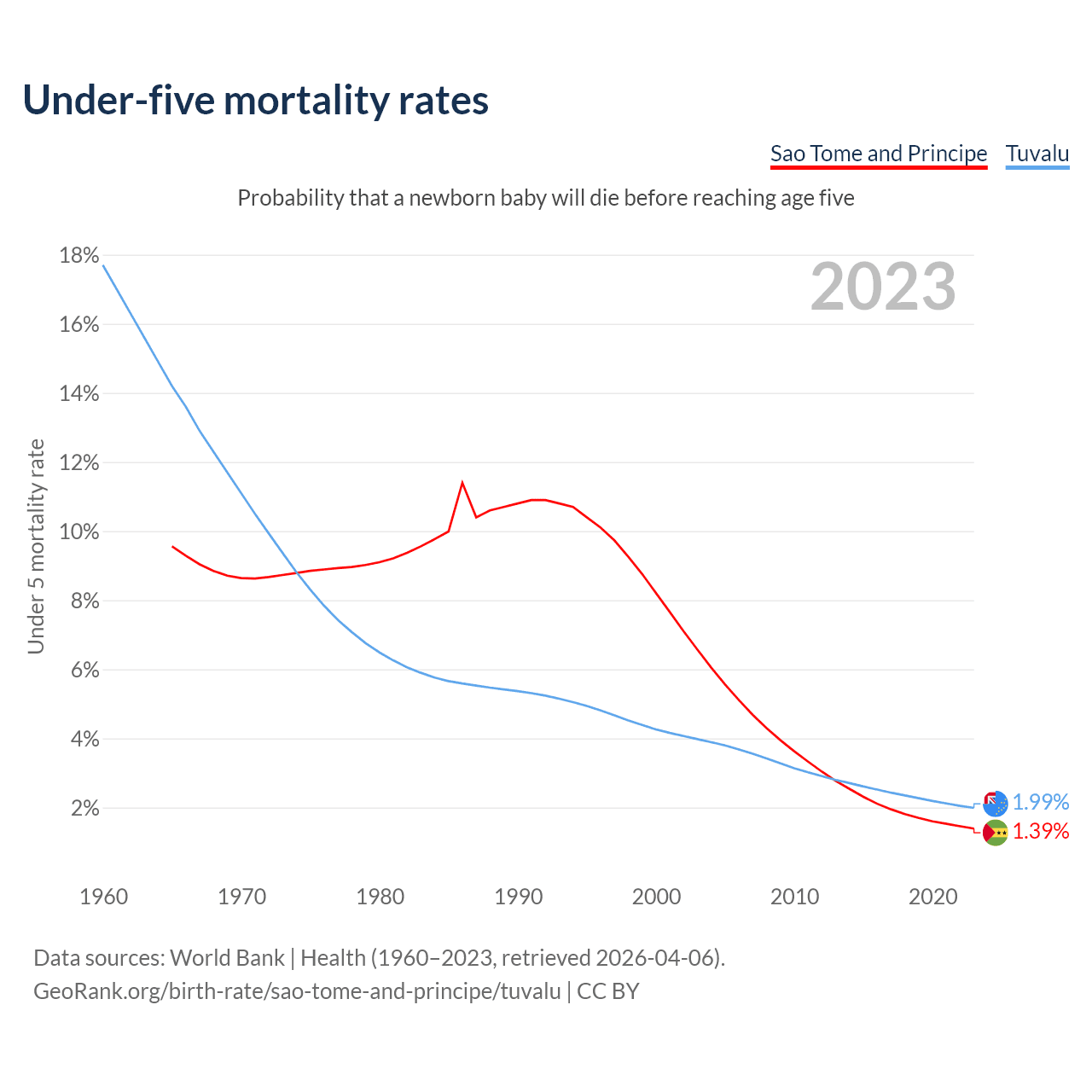 The chance that a newborn baby will die before reaching age five is 1.39% in Sao Tome and Principe and 1.99% in Tuvalu. Above is a chart with historical data on under-five mortality rates.