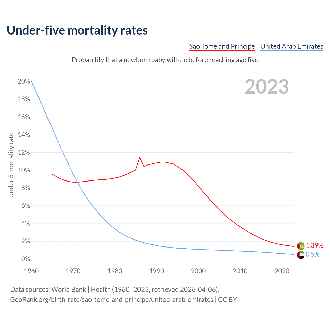 The chance that a newborn baby will die before reaching age five is 1.39% in Sao Tome and Principe and 0.5% in the United Arab Emirates. Above is a chart with historical data on under-five mortality rates.