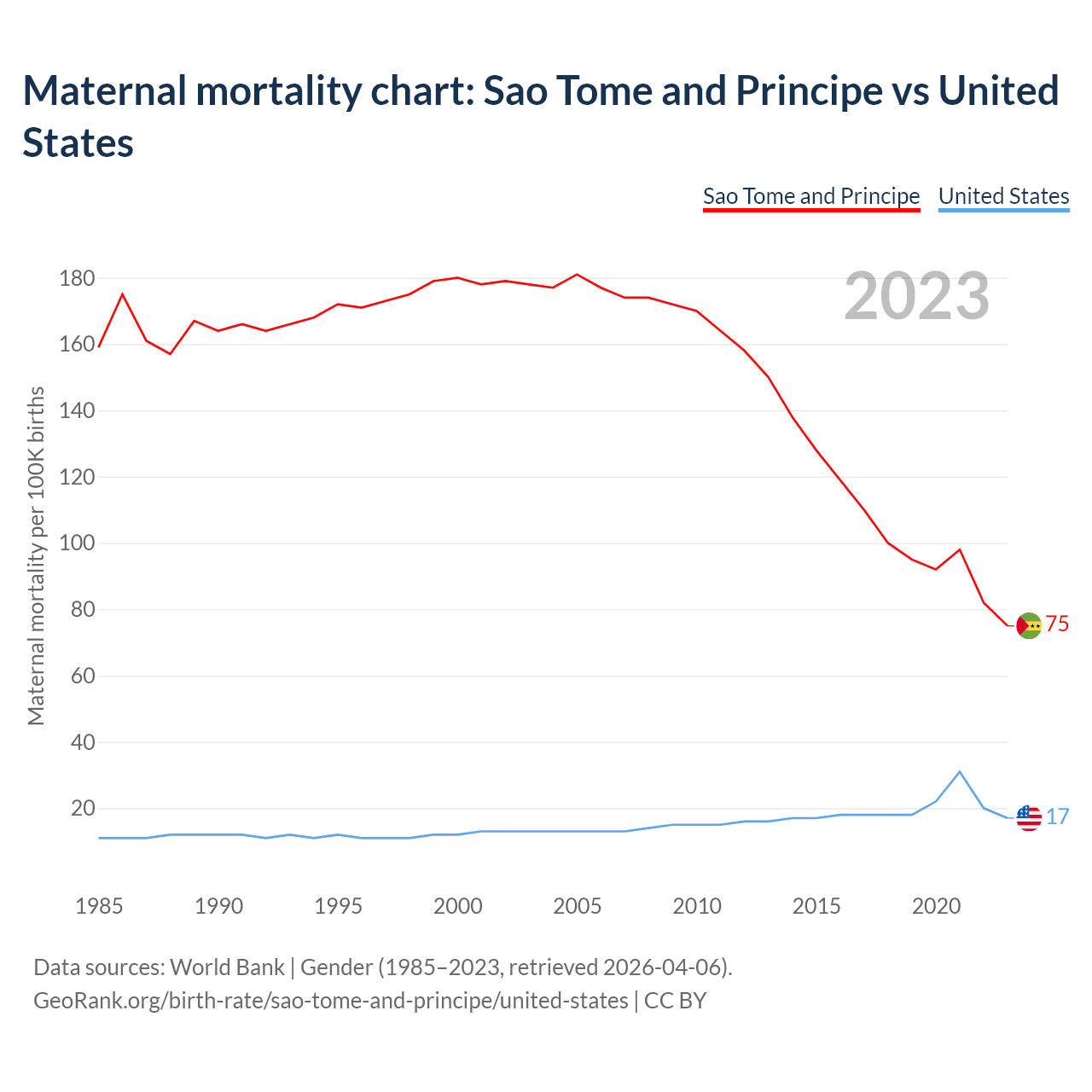 The maternal mortality rate, which is the probability of dying during childbirth or within 42 days of pregnancy termination, is 75 deaths per 100,000 live births in Sao Tome and Principe, compared to 17 deaths in the United States.