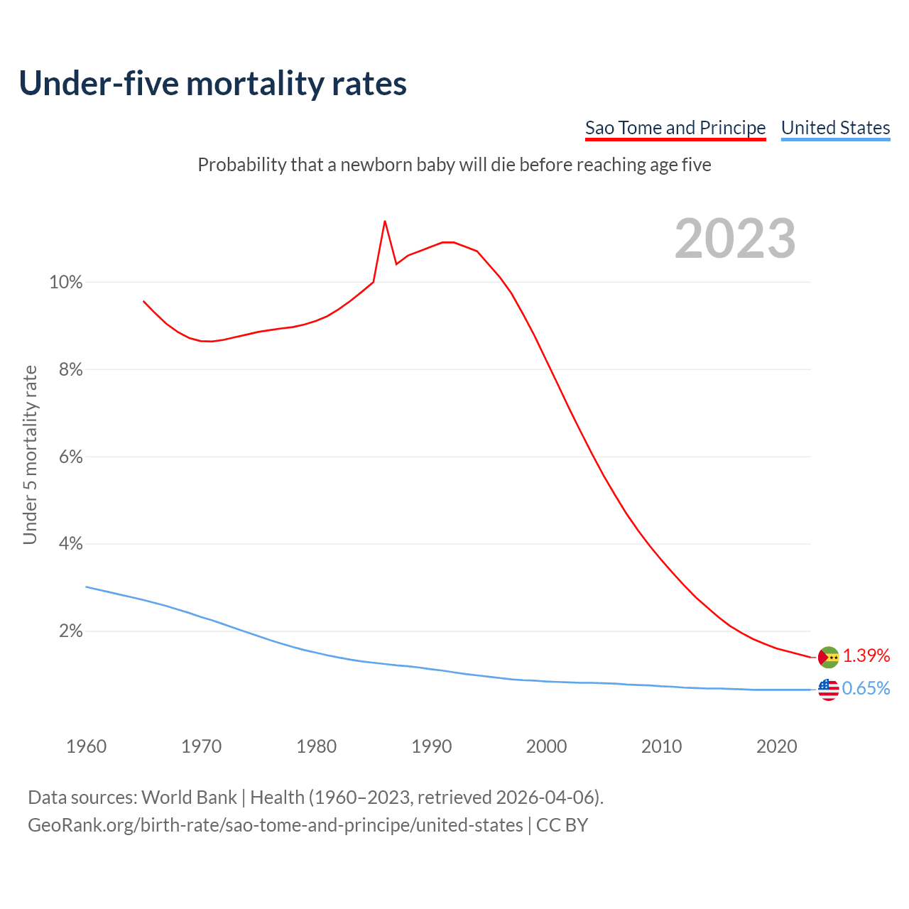 The chance that a newborn baby will die before reaching age five is 1.39% in Sao Tome and Principe and 0.65% in the United States. Above is a chart with historical data on under-five mortality rates.