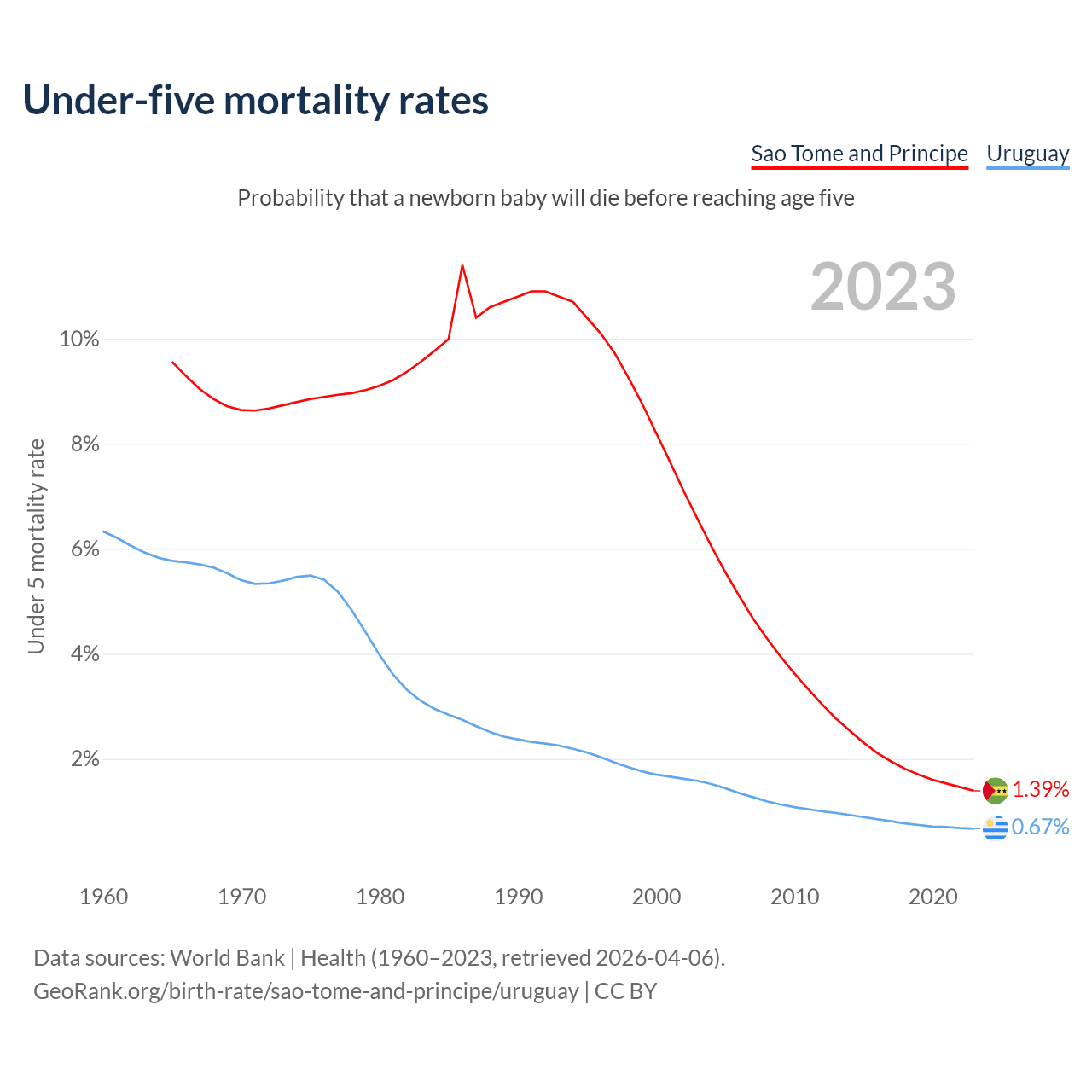 The chance that a newborn baby will die before reaching age five is 1.39% in Sao Tome and Principe and 0.67% in Uruguay. Above is a chart with historical data on under-five mortality rates.