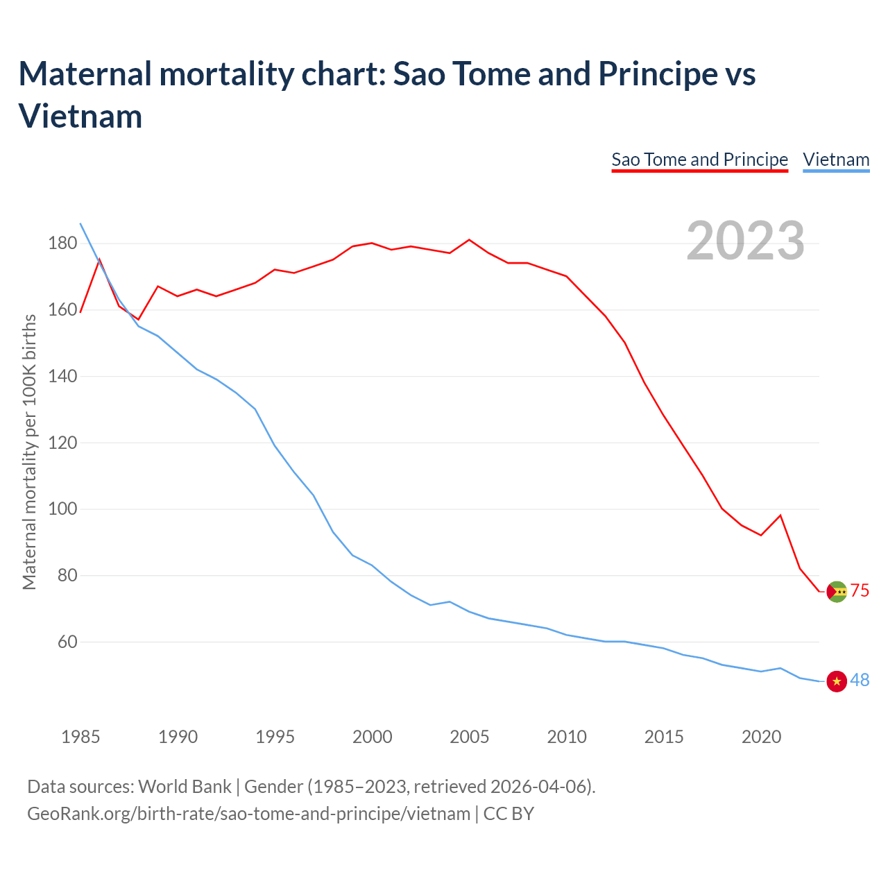 The maternal mortality rate, which is the probability of dying during childbirth or within 42 days of pregnancy termination, is 75 deaths per 100,000 live births in Sao Tome and Principe, compared to 48 deaths in Vietnam.