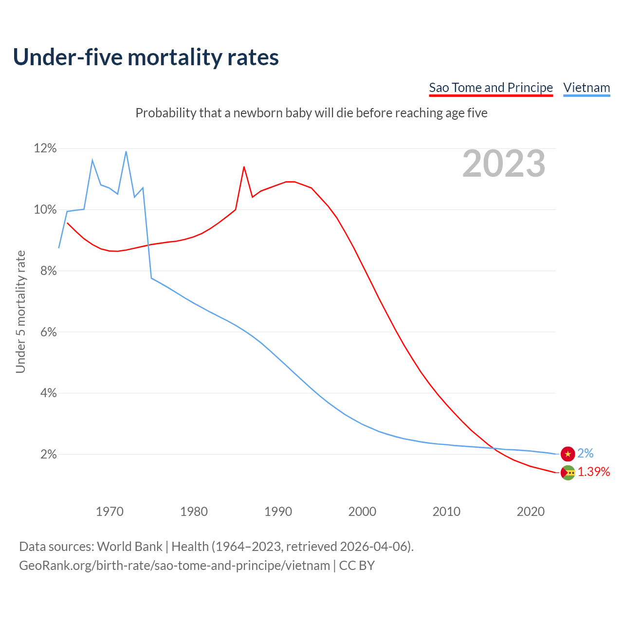 The chance that a newborn baby will die before reaching age five is 1.39% in Sao Tome and Principe and 2% in Vietnam. Above is a chart with historical data on under-five mortality rates.