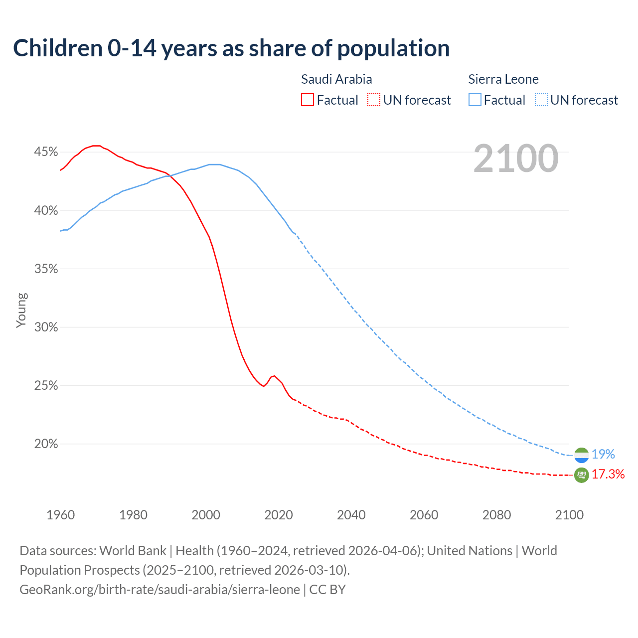According to the latest available data on birth rates, the fertility rate in Saudi Arabia was 2.28 children per woman in 2023, compared to 3.79 in Sierra Leone in 2023. The replacement level is considered to be 2.1 children per woman.
