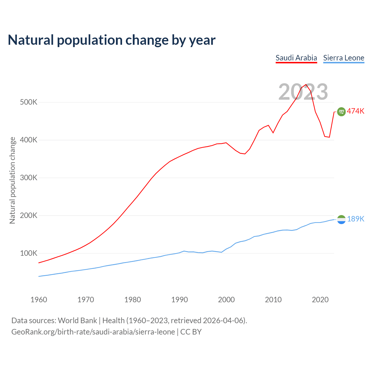 Saudi Arabia has an annual birth rate of 16.4 births per 1,000 people, compared to 30.6 for Sierra Leone. The average number of children a woman is expected to have during her lifetime — the fertility rate, is 2.28 in Saudi Arabia and 3.79 in Sierra Leone — 66.3% difference.