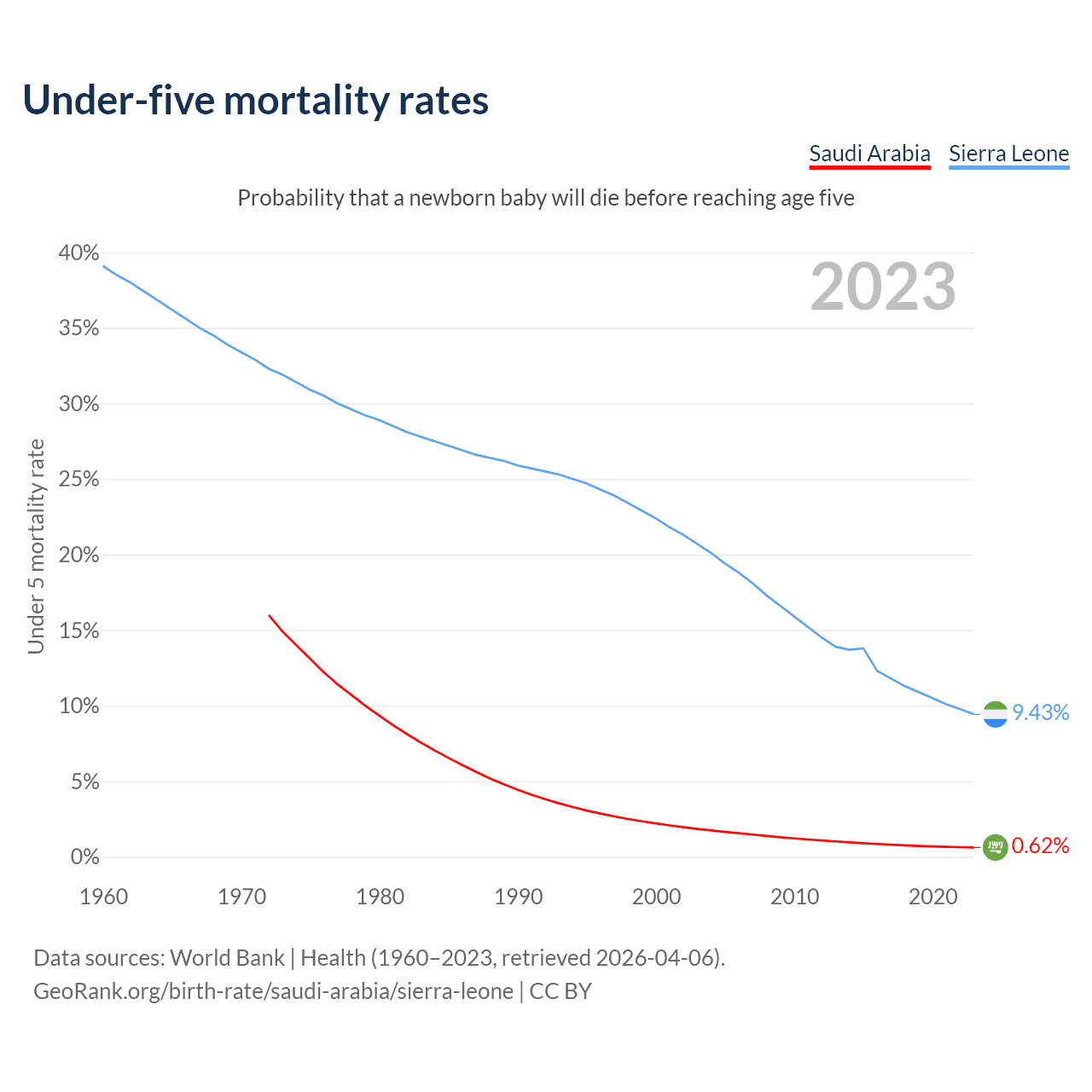 The chance that a newborn baby will die before reaching age five is 0.62% in Saudi Arabia and 9.43% in Sierra Leone. Above is a chart with historical data on under-five mortality rates.